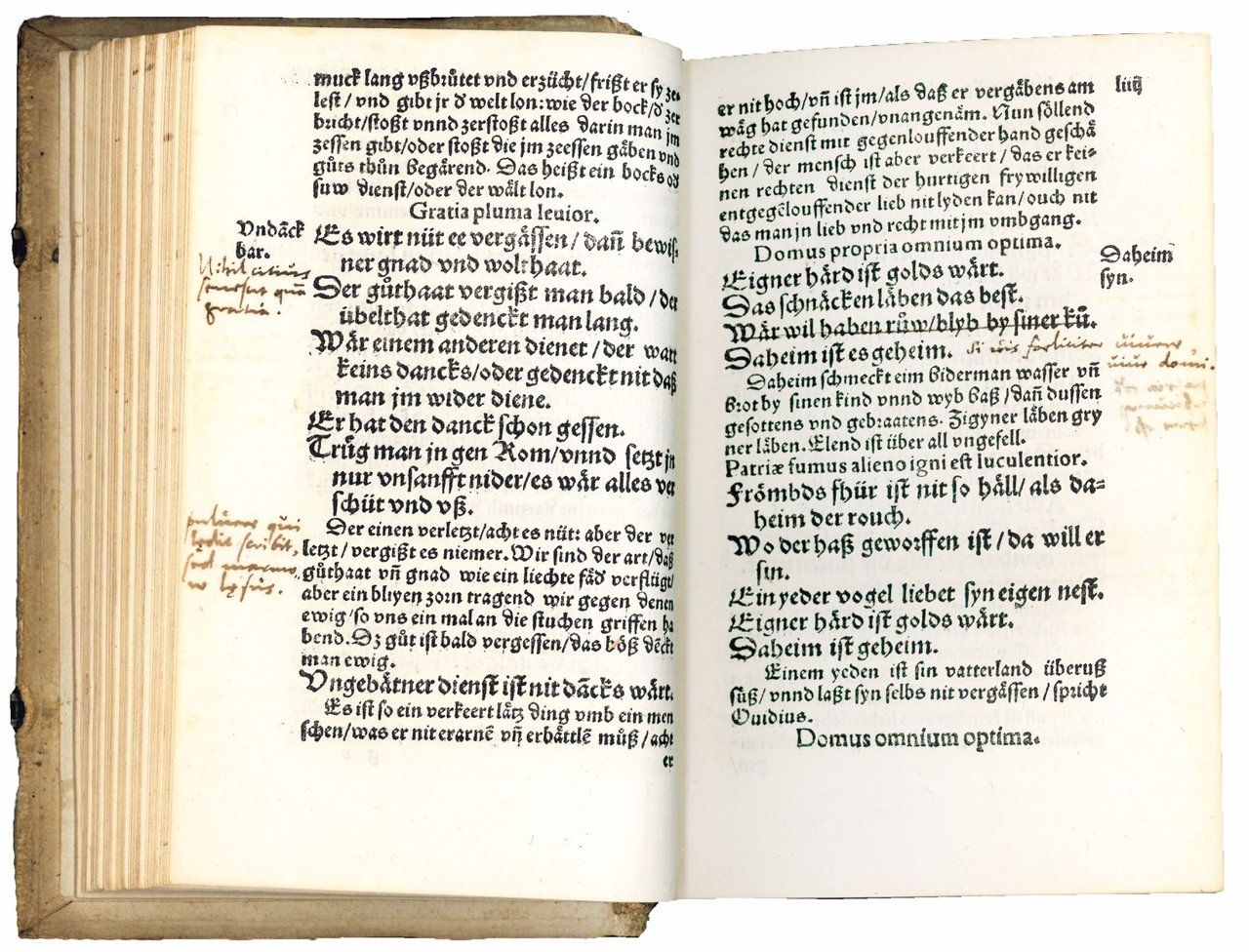 Second edition (the first was printed in Frankfurt by C. Egenolff in 1541) of this fundamental and incredibly successful collection of seven thousand proverbs, recast in Swiss German by the printer, newly arranged by subject by Konrad Pellikan (1478-1556) and provided with an index for each part. Some of the German proverbs are accompanied by Latin equivalents. This second edition is the only one, along with the first, to include Franck's name in the title; all subsequent editions omit him.