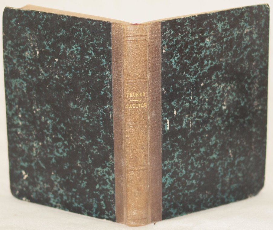 In 8. Dim. 20,5x14,5 cm. Pp. VIII+406. Interessante opera del 1875, un manuale di tattica applicata scritto dal Generale Peuker. Tra gli argomenti trattati: nozioni generali, tattica, Il terreno per rispetto all'impiego delle truppe, Marcie e stato di riposo (predisposizioni per la marcia, impiego delle ferovie e del telegrafo elettrico, trasporto sulle ferrovie, telegrafi militari, baraccamenti e bivacco, vettovagliamento), Servizio di sicurezza e di ricognizione (sicurezza della marcia, avamposti ecc.), Studio analitico del combattimento, Le operazioni di piccola guerra ecc. In buone condizion Copertina in mezza tela con titolo in oro al dorso in buone condizioni generali con lievi usure ai margini e dorso. Legatura in buone condizioni. All'interno le pagine si presentano in buone condizioni con fioriture. Interesting work of 1875, a manual of applied tactic written by General Peuker. Inside different notins of tactic, march and rest, usage of railways and electric telegraph, food, Service of security, study of fighting, operations of little war etc. In good conditions. Half cloth cover with golden title in the spine in good general conditions slightly worn in the edges and spine. Binding in good conditions. Inside pages are in good conditions with foxings.