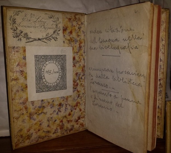 In-8 (17 cm)(2) 101 (3) Piena pergamena con titolo manoscritto al dorso e contropiatti rivestiti di carta marmorizzata e tagli spruzzati di rosso. Qualche foro da tarlo al margine bianco inferiore da p. 6, che va scomparendo verso la fine. Ex-libris Franz Pollack-Parnau e Scannis de Bizzarro. Appunti a matita alla pagina bianca iniziale. Esemplare proveniente dalla bilioteca Soranzo, che vi fece un appunto a penna alla prima pagina bianca. Celebre opera anonima contro Venezia di varia attribuzione. Seconda non comune edizione di questo "Pampleth" nei confronti della Repubblica di Venezia, testo che fu soggetto alla censura, ritirato e fatto bruciare. Edita la prima volta nel 1612. L'opera è attribuita ad Alfonso de Cueva, ambasciatore della Spagna, presso la città lagunare ma si parla anche di Possevino e arco Velsero. Il Peignot nel suo "Dictionnaire des Ouvrages Condamnes au feu"così scrive: "Ouvrage seditibux et rare. Il a ete Brulè par ordre du Senat de Venise. On n'en connait pas l'auteur precisement…Il pretend monster dans cet ouvrage que la Republique de Venise n'est pas nee libre, qu'elle est un ancien domaine de l'Empire, et que, par consequent l'Empereur et l'Empire conserrvent sur la Republique leurs droits et leurs memes pretentions. Cet auteur semble avoir prevu la sorte de Venise. Quoi qu'il en soit, son livre a donnè lieu a' Fra Paolo (Sarpi) de Faire l?Histoire du Concile de Trente pour Mortifier la cour de Roe, et il n'y a que trop bien. Reussiò (II, p. 144-145). Melzi, Dizionario di opere anonime e pseudonime, III, p. 93; Parenti, Dizionario dei luoghi di stampa falsi, inventati o supposti, p. 143; Autori italiani del Seicento, III, p. 226-227, n. 1013-1016. (II, P.144-145)”MELZI, DIZIONARIO DI OPERE ., IIIP.93; PARENTI, DIZIONARIO DEI LUOGHI DI STAMPA FALSI ., P.143; AUTORI ITALIANI DEL SEICENTO, III,p.226-227, N.1013-1016; BRUNET V, 502; CICOGNA 129. LOZZI 6133.