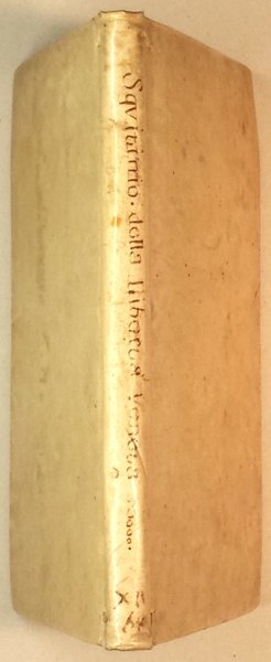 In-8 (2) 101 (3). Piena pergamena con titolo manoscritto al dorso. Pagine lievemente arrossate, ex-libris Lucatello. Celebre opera anonima contro Venezia di varia attribuzione. Seconda non comune edizione di questo "Pampleth" nei confronti della Repubblica di Venezia, testo che fu soggetto alla censura, ritirato e fatto bruciare. Edita la prima volta nel 1612. L'opera è attribuita ad Alfonso de Cueva, ambasciatore della Spagna, presso la città lagunare ma si parla anche di Possevino e arco Velsero. Il Peignot nel suo "Dictionnaire des Ouvrages Condamnes au feu" così scrive: "Ouvrage seditibux et rare. Il a ete Brulè par ordre du Senat de Venise. On n'en connait pas l'auteur precisement…Il pretend monster dans cet ouvrage que la Republique de Venise n'est pas nee libre, qu'elle est un ancien domaine de l'Empire, et que, par consequent l'Empereur et l'Empire conserrvent sur la Republique leurs droits et leurs memes pretentions. Cet auteur semble avoir prevu la sorte de Venise. Quoi qu'il en soit, son livre a donnè lieu a' Fra Paolo (Sarpi) de Faire l'Histoire du Concile de Trente pour Mortifier la cour de Roe, et il n'y a que trop bien. Reussiò (II, p. 144-145). Melzi, Dizionario di opere anonime e pseudonime, III, p. 93; Parenti, Dizionario dei luoghi di stampa falsi, inventati o supposti, p. 143; Autori italiani del Seicento, III, p. 226-227, n. 1013-1016. (II, P.144-145)”MELZI, DIZIONARIO DI OPERE ., III, P.93; PARENTI, DIZIONARIO DEI LUOGHI DI STAMPA FALSI ., P.143; AUTORI ITALIANI DEL SEICENTO, III, P.226-227, N.1013-1016; BRUNET V, 502; CICOGNA 129. LOZZI 6133.