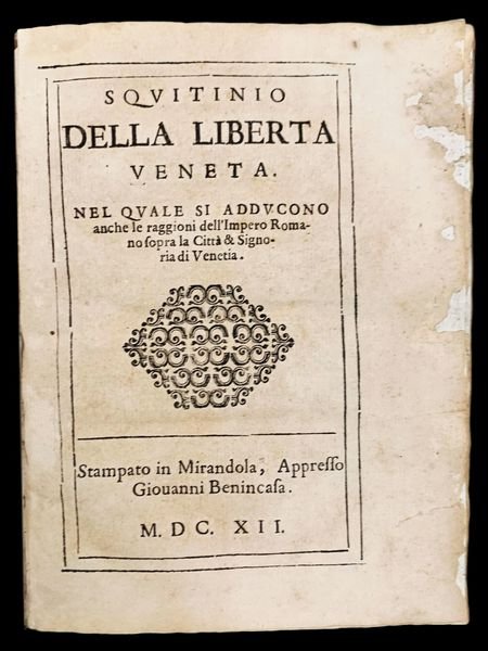 In 4° (19,5x15 cm); 77, (1), (2 b.) pp. Legatura coeva in piena pergamena. Qualche lieve difetto. Una fascetta antica che integra piccole mancanze di carta sul lato esterno bianco delle prime tre carte e due piccole pecette che integrano due piccoli forellini agli angoli bianchi esterni delle ultime due carte. Un forellino alla quarta carta tocca una lettera nelle glosse laterali. Nelle ultime quattro carte leggermente sfrangiato langolo esterno, ininfluente, nel margine bianco e lontano dal testo. Nel complesso esemplare genuino in buone-ottime condizioni di conservazione. Prima non comune edizione di questopera, uscita anonima ed attribuita, fra gli altri al Marchese Bedmar Alfonso de la Cueva (1572-1655), ambasciatore spagnolo a Venezia, a Marcus Welser e a Possevino che rappresenta una dei più forti pampleth antiveneziani del seicento, tanto inviso alla Serenissima da esser espressamente ordinato dal Minor Consiglio, di recuperare tutte le copie possibili dellopera e di distruggerle. Il celebre avvocato e bibliografo francese, Étienne-Gabriel Peignot (Arc-en-Barrois, 15 maggio 1767 Digione, 14 agosto 1849), nella sua opera Dictionnaire des Ouvrages Condamnes au feu scrive riferendosi a questopera "Ouvrage seditibux et rare. Il a ete Brulè par ordre du Senat de Venise. On n'en connait pas l'auteur precisement Il pretend monster dans cet ouvrage que la Republique de Venise n'est pas nee libre, qu'elle est un ancien domaine de l'Empire, et que, par consequent l'Empereur et l'Empire conserrvent sur la Republique leurs droits et leurs memes pretentions. Cet auteur semble avoir prevu la sorte de Venise. Quoi qu'il en soit, son livre a donnè lieu a' Fra Paolo (Sarpi) de Faire lHistoire du Concile de Trente pour Mortifier la cour de Roe, et il n'y a que trop bien. Reussiò (II, p. 144-145). Melzi, Dizionario di opere anonime e pseudonime, III, p. 93; Parenti, Dizionario dei luoghi di stampa falsi, inventati o supposti, p. 143; Autori italiani del Seicento, III, p. 226-227, n. 1013-1016. (II, P.144-145). Rara opera. Rif. Bibl.: Haym, vol. I, pag. 97, n. 2 "edizione rara abbriciata dal senato"; Cicogna, 894; Lozzi, 6133; Platneriana 420.