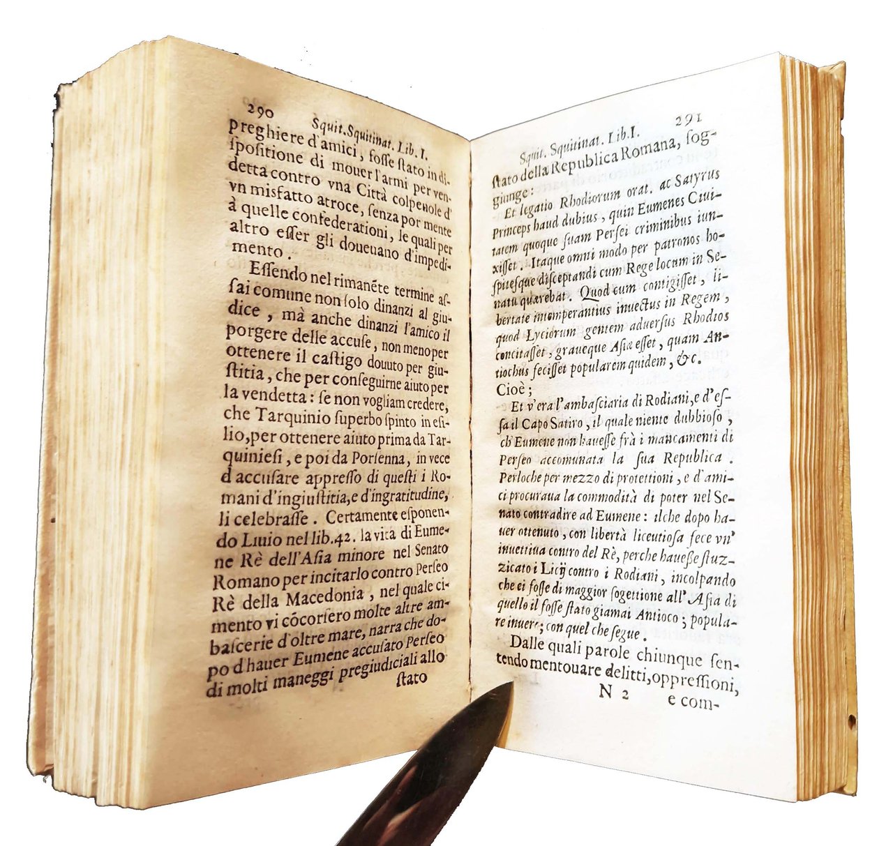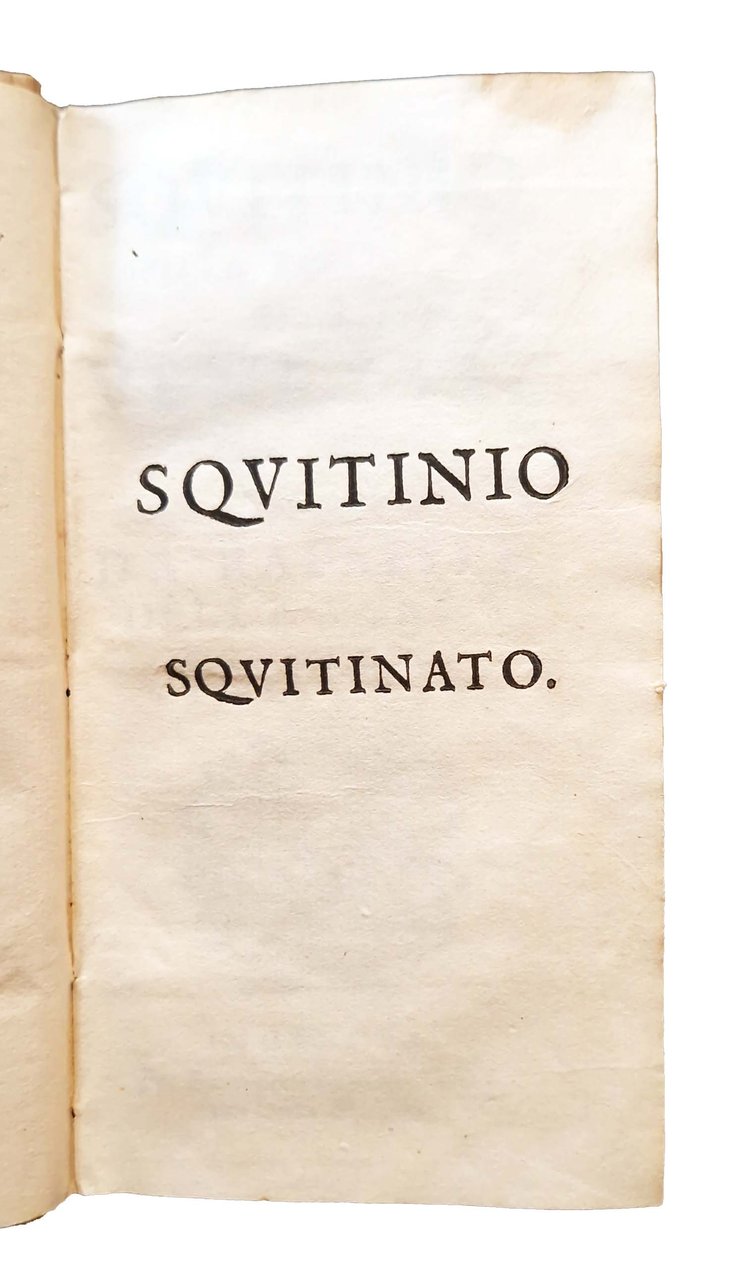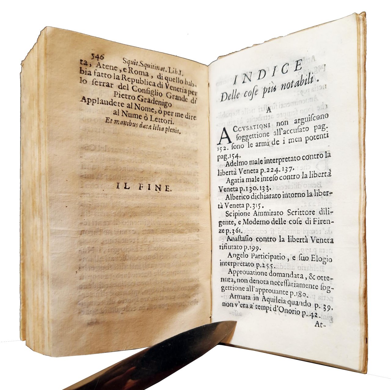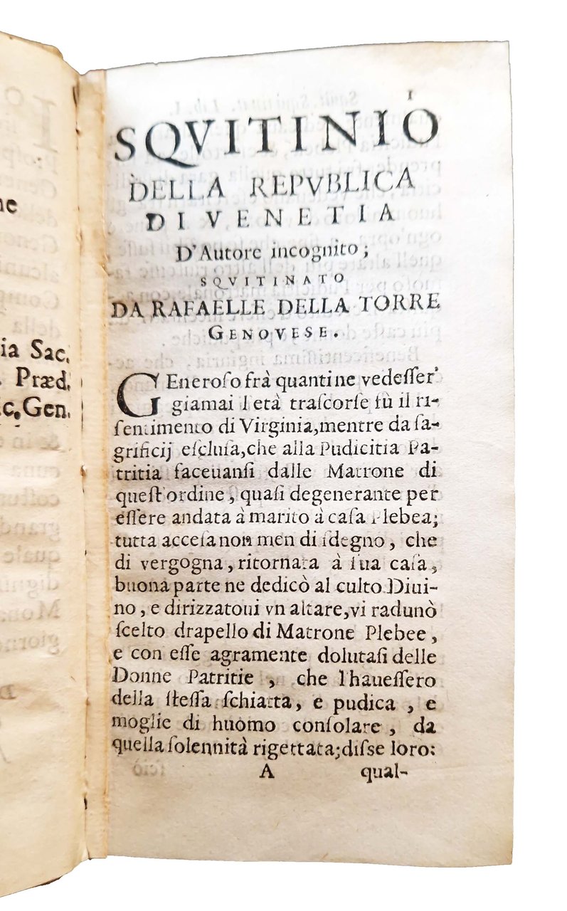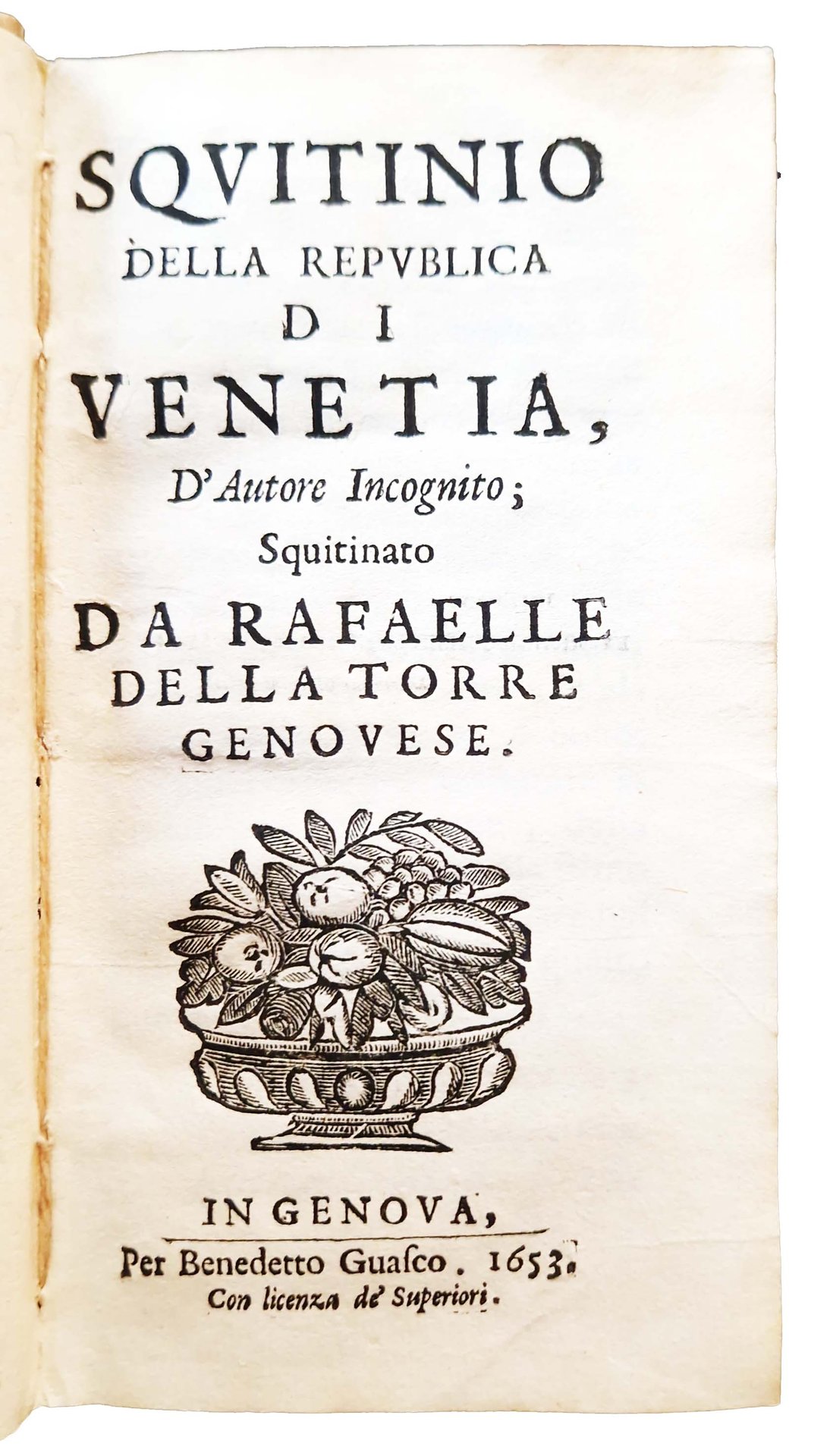in-12°, 146x80 mm, leg. coeva in pergamena con dorso a tre nervi, titolo manoscritto al dorso; pp. [8], 546, [30]. Vignetta xil. al frontespizio. Titolo dell'occhietto: Squitinio squitinato. Edizione originale di quest'opera storica/politica a cura del Della Torre, scritta in risposta al celebre pamphlet antiveneziano pubblicato anonimo, teso a sostenere la illegittimità del governo della Serenissima. Raffaele Della Torre (1579-1666) è stato un giurista e storico italiano, importante pubblicista e uomo politico; fu il principale rappresentante della fazione filo-francese a Genova verso la metà del XVII secolo. Rif.: IT\ICCU\VEAE\005975. OCLC, 43058233. Cond.: Rari piccoli lavori di tarlo al dorso e al contropiatto posteriore. Carte abbastanza pulite. Esemplare molto buono.