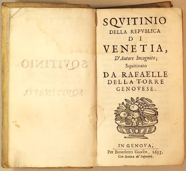 In-8 (10) 546 (24). Piena pergamena coeva. Piccolo foro di tarlo alle ultime due carte. Buon esemplare. Volume piuttosto raro scritto in risposta al celebre pamphlet antiveneziano pubblicato anonimo, teso a sostenere la illegittimità del governo della Serenissima. Raffaele Della Torre studiò a Roma, a Bologna e infine a Parma, dove rimase fino al 1606, quando tornò a Genova e poco dopo ottenne il primo incarico pubblico, dando inizio a una lunga ed importante carriera. Nel 1624 fu sorteggiato governatore, trovandosi così a svolgere un ruolo importante durante il respinto attacco di Carlo Emanuele I di Savoia a Genova nel 1625. Nel 1628 alla scoperta della congiura di Giulio Cesare Vachero fu nominato consultore dei governatori che dovevano seguire il processo. Nel 1630 fu inviato a Casale per assicurare al governatore di Milano, don Ambrogio Spinola, che la presenza di un residente francese a Genova non era di per sé pregiudizievole ai rapporti con la Spagna; in realtà si stava verificando una svolta nella politica internazionale della Repubblica e il Della Torre si caratterizzò subito come un esponente di spicco del gruppo autonomista e filofrancese. Nel 1633 fu sorteggiato procuratore e nel 1634 partecipò alle trattative per la pace con i Savoia.Nel 1645 fu a Roma. Pubblicò nel 1651 il Dissidentis, desciscentis receptaeque Neapolis libri VI, commissionatogli dal Conte d'Ognate,[2] una ricostruzione della rivolta napoletana di Masaniello del 1647, e nel 1653 lo Squitinio della Republica di Venetia d'autore incognito squitinato. Nel 1654 le ripetute confische di imbarcazioni finalesi spinsero la Spagna a confiscare per rappresaglia i beni genovesi in Spagna, nel ducato di Milano e nel Regno di Napoli. Contribuì allora a indirizzare la diplomazia genovese nella difesa delle tesi della Cyrologia, attaccate da un libretto milanese anonimo (Gli affari del Finale con Genova.). L'anno successivo, dopo che era stato raggiunto un accordo diplomatico, diffuse il proprio punto di vista nell'opera Al curioso del vero. Anche negli ultimi anni della sua vita continuò ad essere consultato su tutte le questioni politiche di rilievo. La sua ultima opera a stampa, dedicata a Ferdinando II de' Medici fu il Restaurandae antiquae iurisprudentiae conatus, pubblicata nel 1666. Non gli riuscì, invece, di pubblicare le Historie delli avvenimenti de suoi tempi, in cui avrebbe voluto ricostruire la storia europea sino alla pace di Westfalia del 1648 e di cui aveva completato il primo volume già nel 1663, e materia di cui sperò anche la collaborazione del cardinal Mazzarino, tramite l'aiuto del fraterno amico Giannettino Giustiniani, quinta colonna del potente cardinale a Genova.Della Torre avrebbe voluto che le sue carte fossero trasferite segretamente in Francia subito dopo la sua morte per consentirne la pubblicazione, ma i Collegi ne disposero il sequestro.Alla sua morte, avvenuta nel marzo 1666, Giustiniani così lo descriveva a Hughes de Lionne (Ministro degli Esteri di Luigi XIV): « É morto il Seneca Christiano, il lume della Liguria, il più chiaro splendore di questa Republica, il signore Raffaele Della Torre, nell'età sua di 87 anni e mesi, alli 21 di questo con intrepidezza e franchezza incomparabili, dicendo che anche nel morire s'imparava, che essendogli sempre stata rappresentata la morte per spaventosa et horribile, la provava dolce, e tranquilla ». Piantanida 1028. Cicogna 897