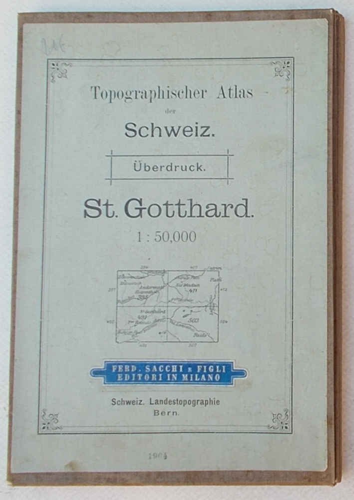 Grande carta geografica in scala 1:50.000 del Topographischer Atlas der Schweiz di cm. 56 x 78, a più colori, montata su tela all'origine, ripiegata e con copertine originali. VG. ** Comprende, tra l'altro, Airoilo e Andermatt.