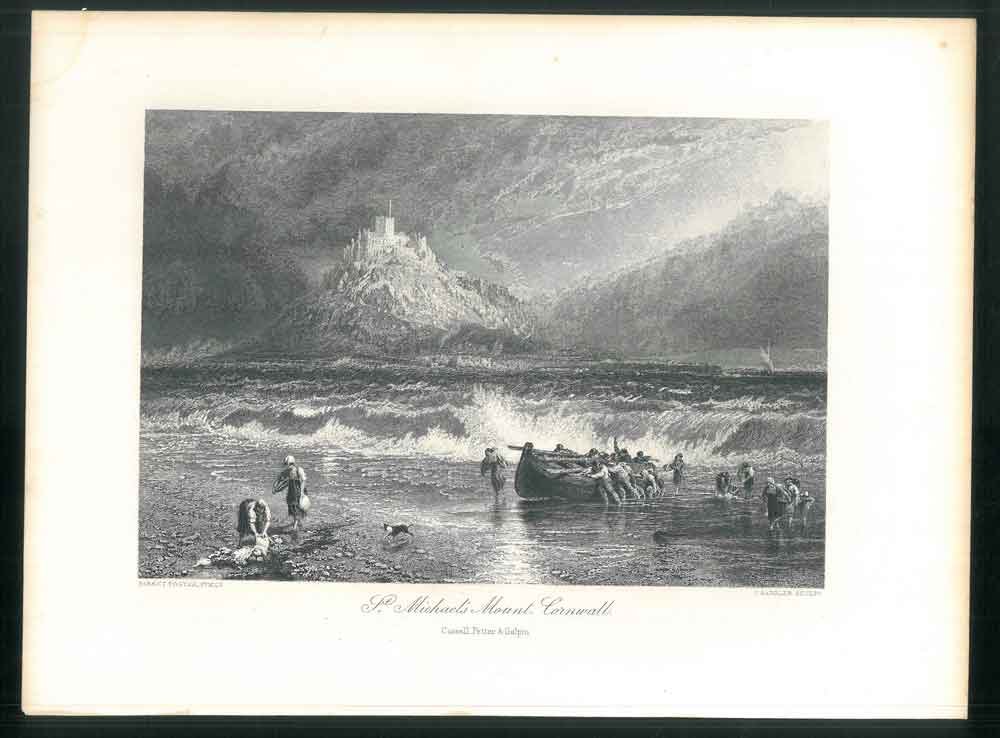 <p>Incisione su acciaio, impronta 27x19 cm, su foglio 31,5 x 23,5. Isola di St. Michael's Mount (Mount's Bay, Cornovaglia) vista dalla spiaggia dove diverse figure trascinano a riva una scialuppa, accompagnati anche da un cane.Tratto da "Picturesque Europe" 1875-1879. Esemplare ben conservato.</p>