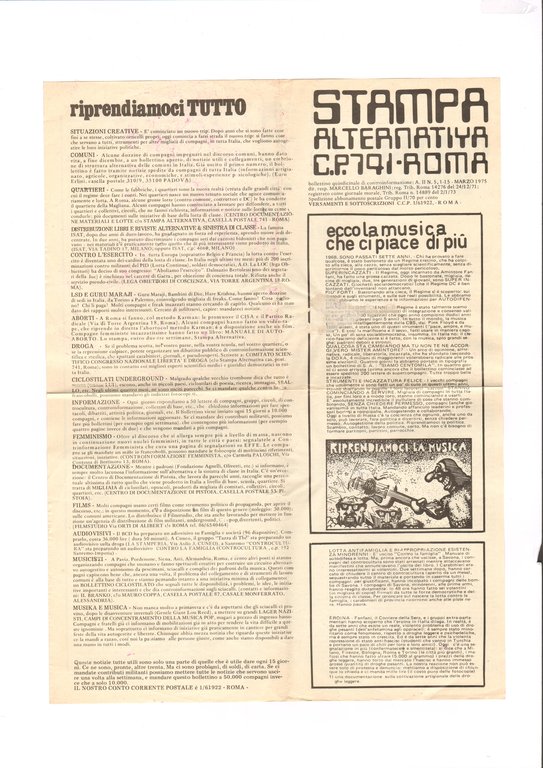 Foglio singolo (cm 34x25) pag. 2. -- Stampa Alternativa è una casa editrice romana fondata nel 1970 sull'esempio delle Alternative Press americane e inglesi, guidata da Marcello Baraghini si propone come un'agenzia di controinformazione e un centro di servizi su tematiche fino ad allora ignorate sia dalle forze istituzionali, sia dai movimenti che si autodefinivano rivoluzionari: sessualità, droghe, energie rinnovabili, viaggi e, più in generale, qualità della vita.