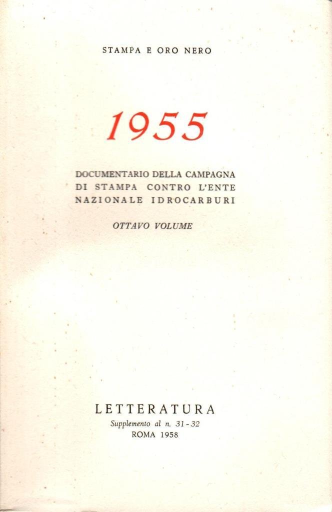 "Stampa e oro nero 1955. Vol. 6-7-8-9. Documentario della campagna di stampa contro l'ente nazionale idrocarburi", edizione 1958, pp. 390 + 440 + 609 + 611, formato 14 x 21.