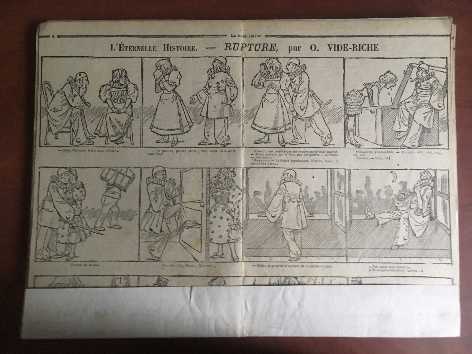 LE SUPPLÉMENTStampa originale fine '800 su cartoncino coevopagina centrale di Le SupplémentL'ÉTERNELLE HISTOIRE - RUPTURE par O. Vide-Richeformato stampa 34,5x40 cmformato con cartoncino 34,5x40 cm (30 g circa)in ottimo stato salvo piccolo strappo bordo inferiore come da foto E22461