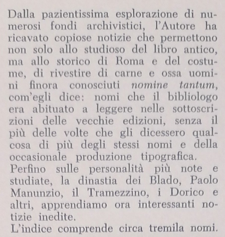 (Editoria; Secolo XVI°; Roma; Bibliologia) In 8°, brossura editoriale con bandelle, titoli in rosso e nero ed illustrazione al piatto anteriore, pp. VII,(1),339,(5), con 18 illustrazioni in bianco e nero a piena pagina su tavole fuori testo. Prefazione di Francesco Barberi. Ottimo stato di conservazione.