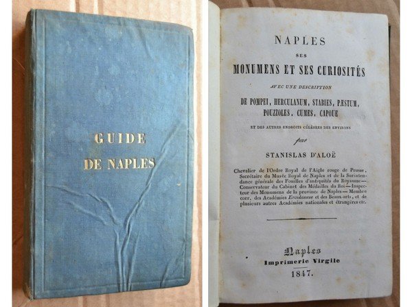 Note: In 16°, t. t. edit. con titolo in oro (minime tracce d'uso), pp. 435, con una piantina ripiegata più volte b.n. f.t. di Napoli; sporadiche e rade fioriture sparse; ex - libris prec. prop. ai risguardi ant.; interessante guida di Napoli in lingua francese; buon es.