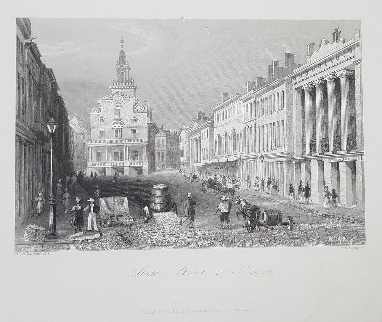 Veduta animata di State Street a Boston nel Massachussets del 1860 circa. Autore: A. H. Payne su soggetto di W. H. Bartlett Data: 1860 circa Tecnica: Acquaforte su acciaio Dimensione del passepartout: 18x25 cm Dimensione dell'incisione: 10x15 cm Condizioni: Buone condizioni. Rare fioritureBeautiful animated view of State Street in Boston in Massachussets of 1860 circa. Author: A. H. Payne after W. H. Bartlett Date: 1860 circa Technique: Steel etching Passepartout Dimension: 18x25 cm Engraving Dimension: 10x15 cm Conditions: Good conditions. Some occasional foxings<BR><BR>