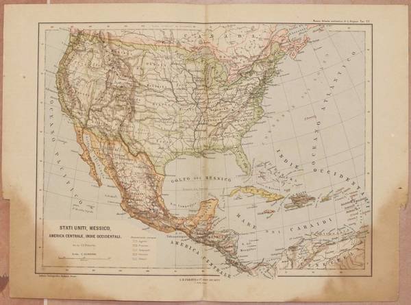 Bella litografia colorata del 1893 tratta dall'opera "Nuovo atlante geografico disegnato sotto la direzione di Luigi Hugues da G. E. Frietzsche". L'incisione rappresenta Gi Stati Uniti, Messico, America centrale e Indie occidentali. INCISIONE: Litografia INCISORE: DIMENSIONI FOGLIO: cm 36,5x26,5 DIMENSIONI INCISIONE: cm 30x22 EPOCA: 1893 CONDIZIONI: Buone condizioni, fioriture e bruniture. Piegatura verticale. Very beautiful lythography of 1893 taken from the geographical work "Nuovo atlante geografico disegnato sotto la direzione di Luigi Hugues da G. E. Frietzsche". View of United States, Mexico, Central America and western Indias. ENGRAVING: Lythography ENGRAVER: upon drawing of G. E. Fritzsche LEAF DIMENSION: 36,5x26,5 ENGRAVING DIMENSION: cm 30x22 DATE: 1893 CONDITIONS: Good conditions. Foxings and yellowings. Vertical folding.<BR>