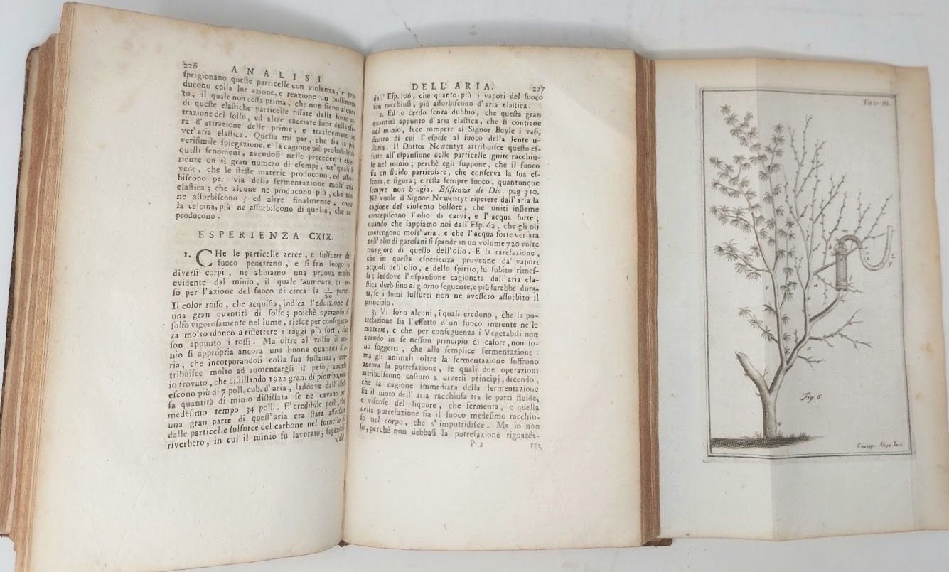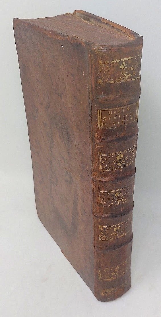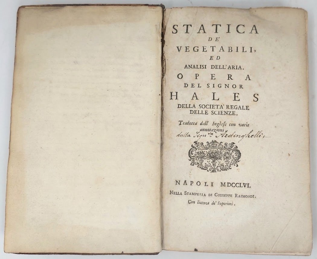 >in-8 (210x125 mm), pp. (8), 368, 20 tavole di interessanti figure scientifiche, incise e ripiegate f.t. poste in fine. Legatura coeva in pelle, dorso ornato oro, tagli rossi (restauri alle cuffie e difetti alle cerniere). Prima edizione italiana, tradotta e commentata dalla signora Maria Angela Ardinghelli (studiosa di scienze e fisica di Napoli, 1728-1825). L'originale inglese apparve nel 1727 sotto il titolo ''Vegetable Staticks or an account of some Statical Experiments on the sap in vegetables being an Essay towards a Natural History of Vegetation''. Venne tradotta in francese dal Buffon a Parigi nel 1735. (Una seconda italiana apparve nel 1776, assai meno rara della presente). Importante studio botanico di Hales (1677-1761, membro della Royal Academy e dell'Académie des Sciences de Paris) nel quale venne per la prima volta studiato e precisato il nutrimento delle piante, il movimento della linfa e la pressione nelle radici, l'influenza dell'aria, dell'umidità e del suolo nella loro crescita. Le sue intuizioni facilitarono le scoperte di Black, Lavoisier e Priestley. Buon esemplare, assai puro e marginoso, sporadiche arrossature, con estese note ms. di mano coeva all'occhietto e al frontespizio. Pritzel 3700. Dibner 26. Horblit 45A. Dict. of Scientic Biogr., VI, 35-48. Wellcome III, 194 (indica solo la seonda ediz. 1776).