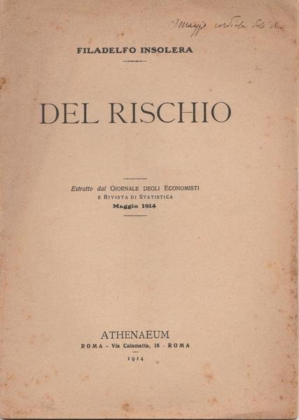 F. INSOLERA DEL RISCHIO ESTRATTO A THENAEUM 1914 L 5557 ESTRATTO DAL GIORNALE DEGLI ECONOMISTI MAGGIO 1914 COPERTINA MORBIDA EDITORIALE CON FIORITURE AI MARGINI E SEGNI DEL TEMPO, AL MARGINE SUPERIORE DEDICA DELL'AUTORE, INTERNO IN BUONO STATO, PIEGA AL CENTRO SU TUTTA L'OPUSCOLO, ALLA QUARTA DI COPERTINA UNA FIRMA A PENNA NERA, N. PAG. 16 CM. 24,5 X 17