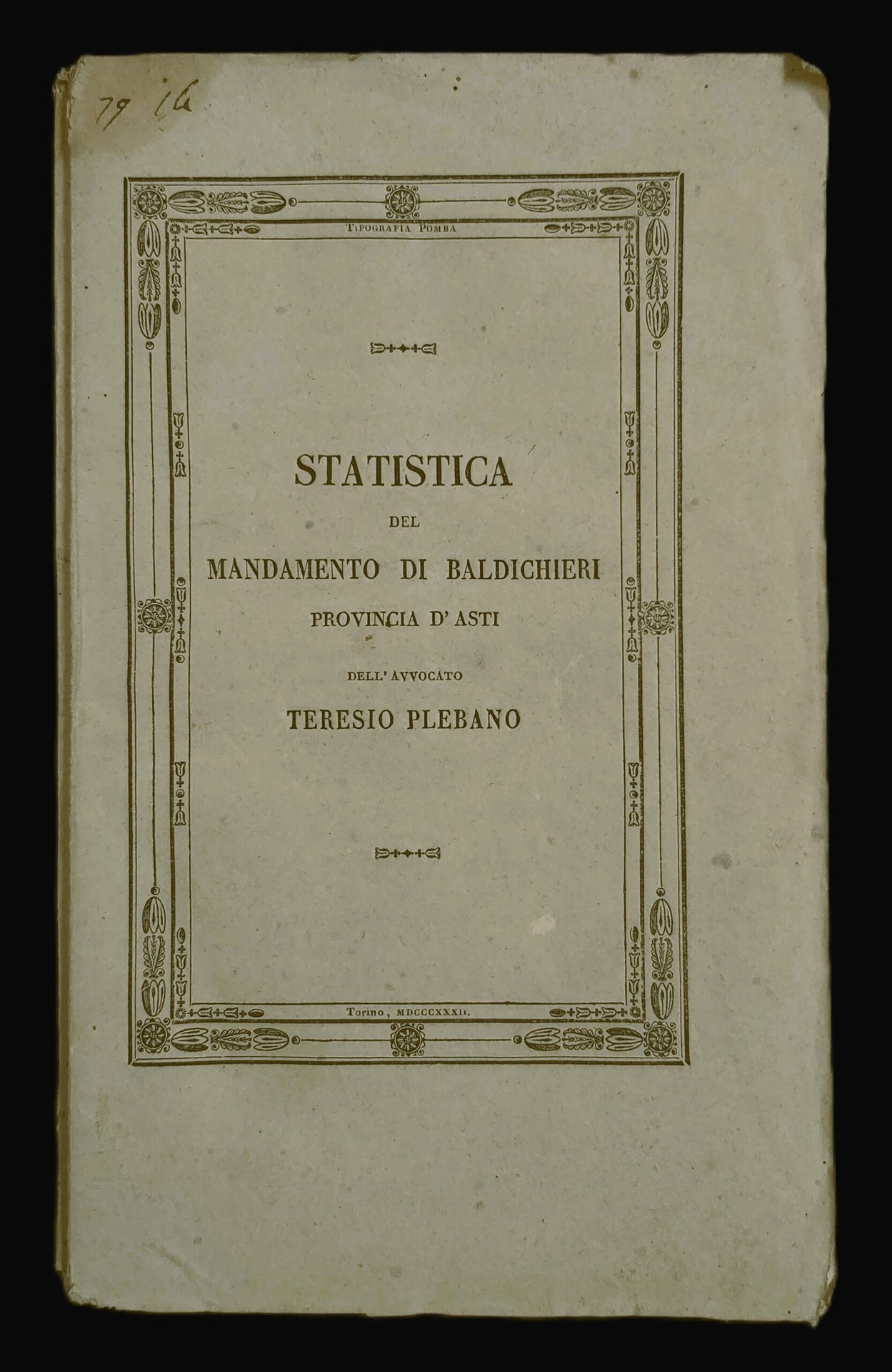 in-16, pp. 92, bross. edit. con cop. xilogr. Importante e raro studio sul comune di Baldichieri corredato da molte tabelle e una tav. rip. con i dati anagrafici di Cantarana, Baldichieri, Tigliole, Villafranca, Monale, Settime, etc. [092]