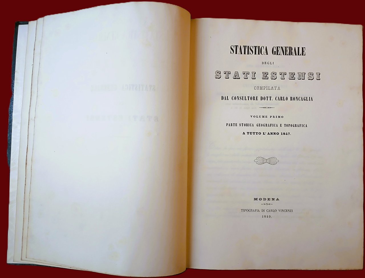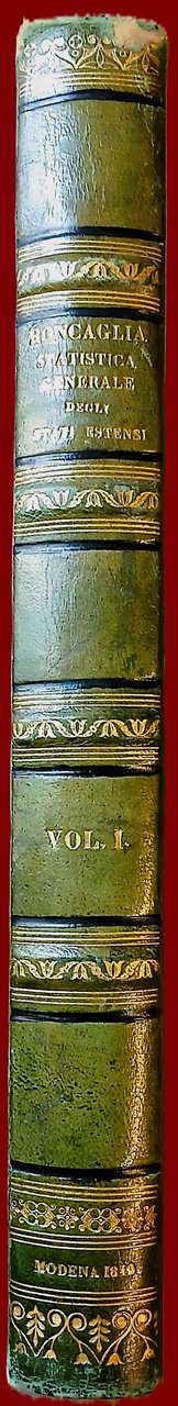 (Ducato di Modena e Reggio; Frignano; Garfagnana; Lunigiana; Massa e Carrara) In 4° piccolo (cm 30 x 22), legatura coeva in pieno marocchino verde con titoli e ricche impressioni in oro, tagli dorati, pp. (8), 324, con una grande tavola più volte ripiegata fuori testo : "Prospetto delle distanze fra i capi luoghi delle Comunità dello Stato calcolate in miglia di Modena". Non è presente la "Carta degli Stati Estensi 1847". A questo primo volume farà seguito nel 1850 un secondo tomo : "Popolazione, agricoltura, prodotti e loro consumazione e commercio, a tutto l'anno 1847" che completa tutto il materiale pubblicato della "Statistica" del Roncaglia. Trascurabili segni del tempo alla legatura, peraltro esemplare in ottimo stato.