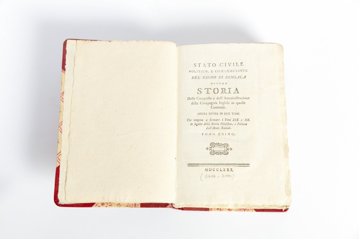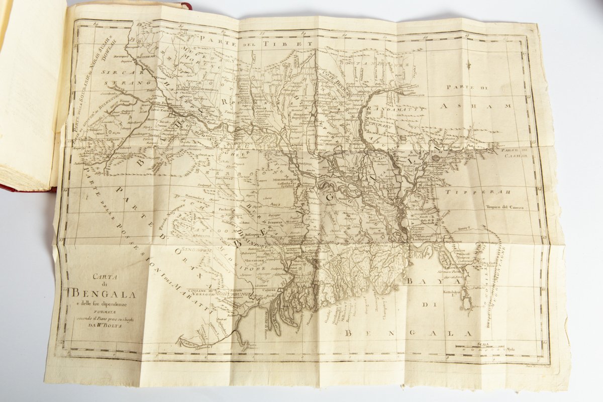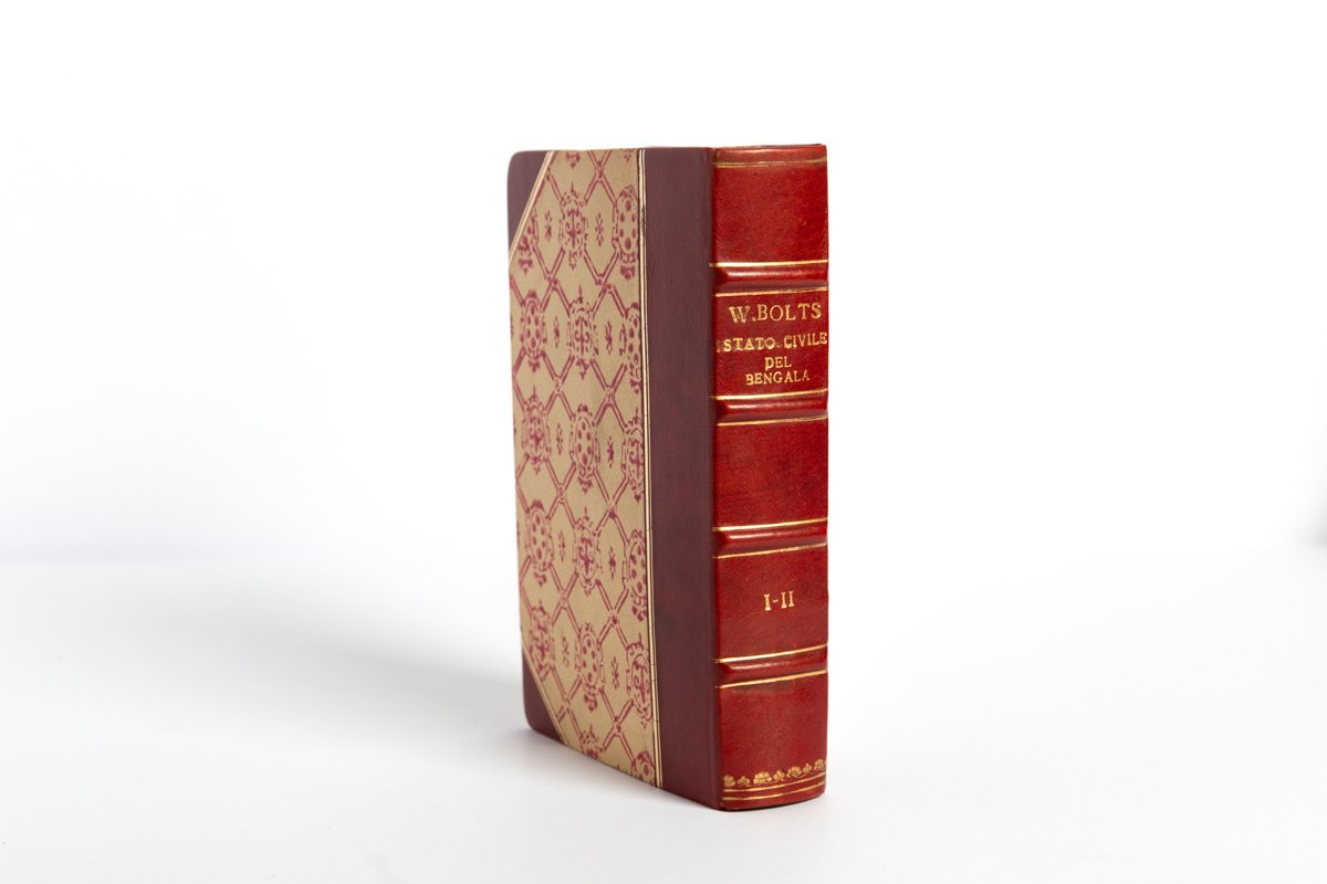 8°, mm 220x140, due volumi in un tomo di pp. (2), 199, (1); 208, (2), con una grande carta geografica ripiegata in fine. Elegante legatura novecentesca in mezza pelle rossa con punte e piatti in carta decorata. Magnifico esemplare, in barbe. Edizione originale in italiano, già apparse in inglese e francese tra il 1772 e il 1773. La prima parte è dedicata alla storia della regione, mentre nella seconda si denunciano i soprusi della Compagnia Inglese delle Indie Orientali. “Bolts was a Dutch adventurer who entered the Bengal civil service and got into trouble for private trading in the name of the East India Company. After being deported to England in 1768, he published this work attacking the government in Bengal”. . *** TUTTI I NOSTRI LIBRI SONO VISIBILI PREVIO CONTATTO MAIL O TELEFONO NELLA NUOVA SEDE DI MILANO: LIBRERIA COSMOPOLIS, VIA JOMMELLI, 22. ***