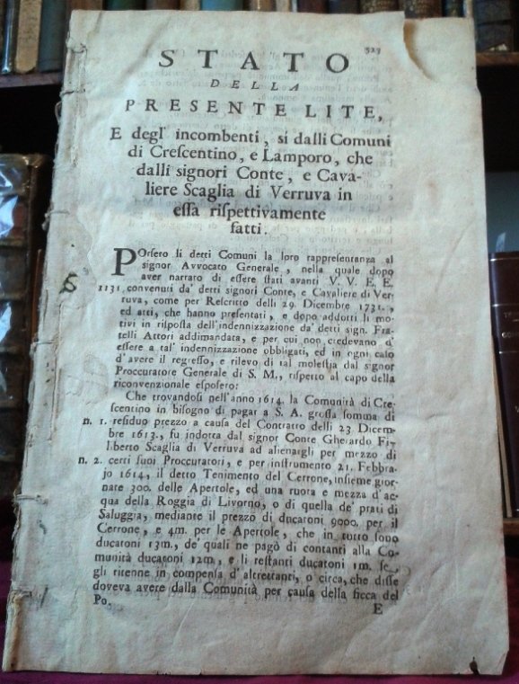 STATO DELLA PRESENTE LITE, E DEGL'INCOMBENTI, SI DALLI COMUNI DI CRESCENTINO, E LAMPORO, CHE DALLI SIGNORI CONTE, E CAVALIERE SCAGLIA DI VERRUVA IN ESSA RISPETTIVAMENTE FATTI.