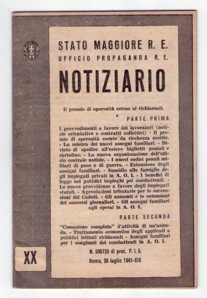 Stato Maggiore R. E. Ufficio Propaganda R. E. Notiziario. Il premio di operosità esteso ai richiamati. Cessazione completa d'attività di un'azienda. N. 505720 di prot. P.I.5. Roma, 20 luglio 1941.