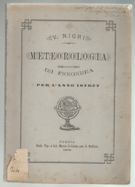 Brossura editoriale a stampa, 8vo cm16x23, pp 86 (14). Tabelle in fine, alcune a colori. Invio manoscritto sul piatto anteriore (piccola mancanza con perdita di qualche lettera all’angolo superiore destro, vedi foto). Il volume contiene una memoria dell’autore sui fatti che portarono alla fondazione della Stazione Meteorologica di Foggia, la sua storia, e la descrizione della dotazione di apparecchiature di misura (“suppellettile scientifica”), le prospettive ecc, il diario meteorologico, le note sull’annata agricola, tabelle (alcune con aggiunte manoscritte d’epoca) e allegati. Curioso e non comune.
