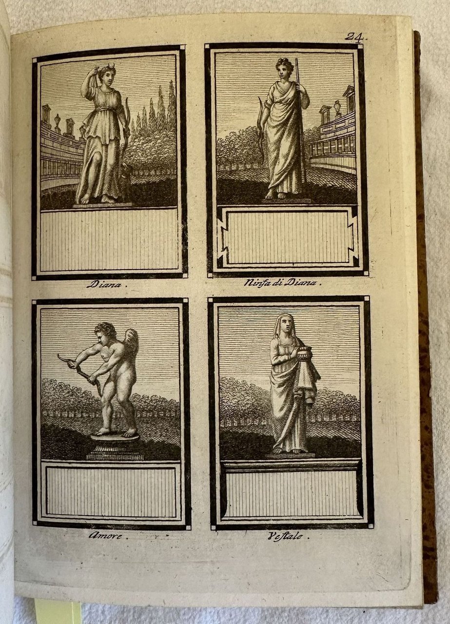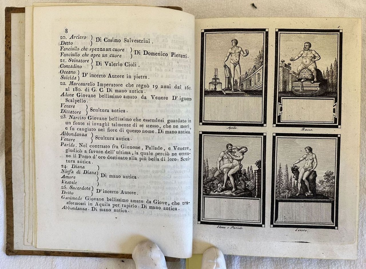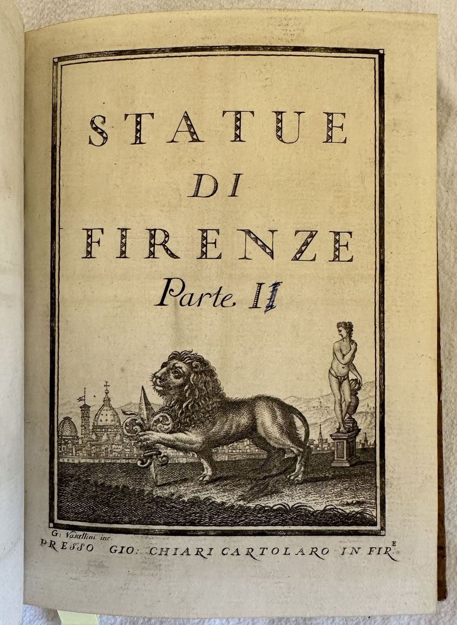 Edizione senza data ma del 1760 circa di questa opera figurata sulle statue di Firenze. L'opera è composta da tre parti legate insieme in un unico volume ed è completa. Introduzione a cura di Giovanni Chiari e catalogo delle statue del Regio Giardino di Boboli colla notizia dei loro autori. Seguono 86 tavole fuori testo la gran parte delle quali mostrano quattro statue (con Boboli come sfondo nella prima parte, uno sfondo nero o grigio nella seconda e terza parte), altre una statua singola entro ovale. Tutte le statue hanno alla base la relativa didascalia e un piccolo cartiglio vuoto poichè l'opera era un "catalogo di figurine" con fogli pubblicati a cadenza periodica perciò molto raro da trovare completo e integro. Le figurine come suggerito dall'editore stesso potevano essere utilizzate a proprio piacimento. Frontespizio calcografico dell'incisore fiorentino Gaetano Vascellini (1745-1805) con il leone fiorentino e sullo sfondo scorcio della città. In ottime condizioni. Copertina in mezza tela in ottime condizioni generali con lievi usure ai margini e dorso. Legatura in buone condizioni. Pagine in ottime condizioni con rare fioriture. In 8. cm 19x14. Pp. (2)+8+25+(2)+8+41+(2)+7+20.Edition of 1760 circa of this figurated work about the statues of Florence. The work is made up of three parts bound together in a unique volume and it is complete. Introduction by Giovanni Chiari and catalogue of statues of Regio Giardino di Boboli with ifnormation about thier authors. Then 86 out of text plates the greatest part of them featuring four statues /with Boboli in the background in the first part; grey and black background in the second and third part), the others single statues in an oval shape. all the statues have their empy didascalia beacuse the work was a catalogue of illustrations published periodically so scarce to be found complete. Calcographic title page by the florentine engraver Gaetano Vascellini (1745-1805) with the florentine lion and view of Florence in the background. In very good conditions. Half cloth cover in very good conditions lightly worn in the extremities. Binding in good conditions. Pages in very good conditions with occasional foxing. In 8. cm 19x14. Pp. (2)+8+25+(2)+8+41+(2)+7+20.