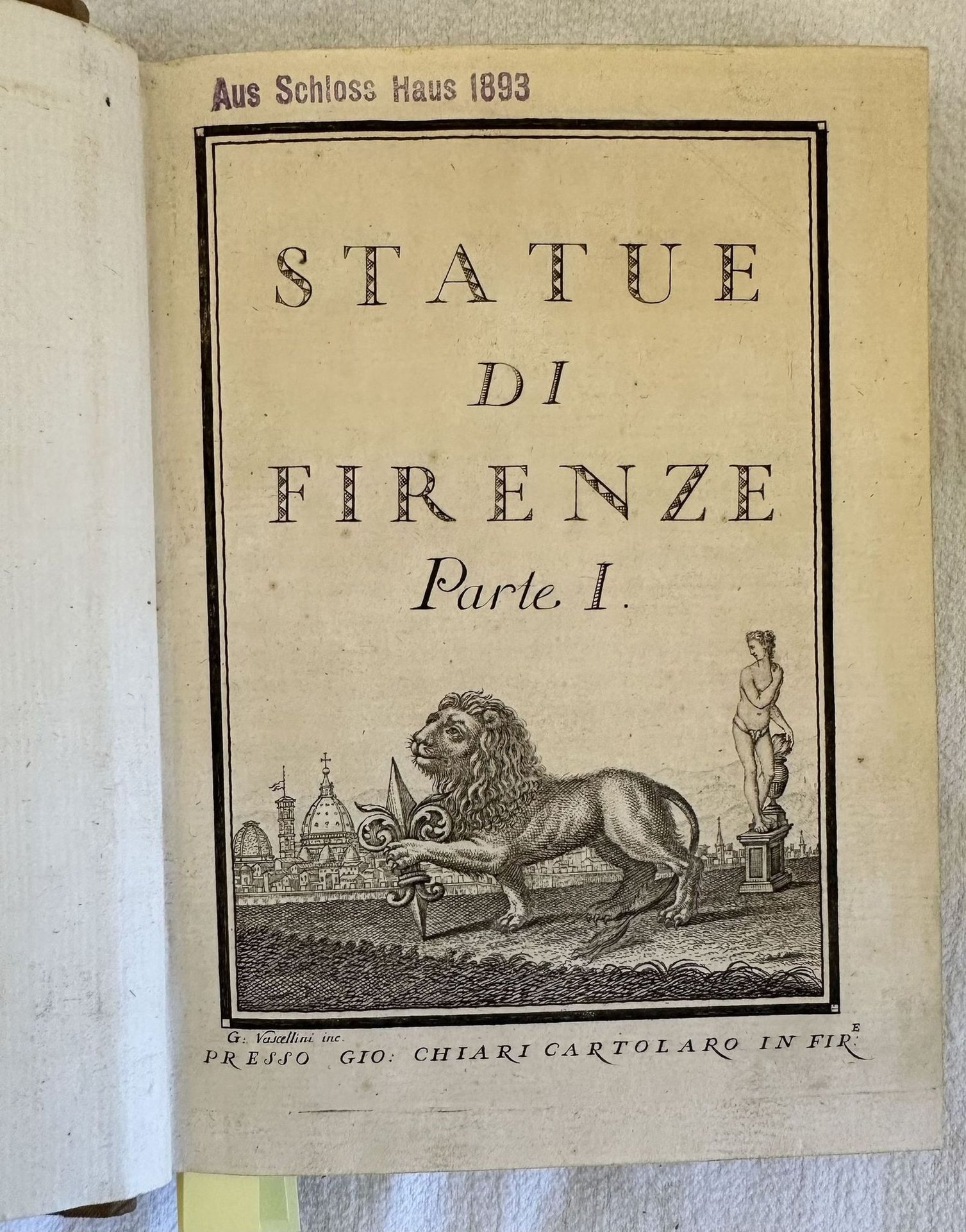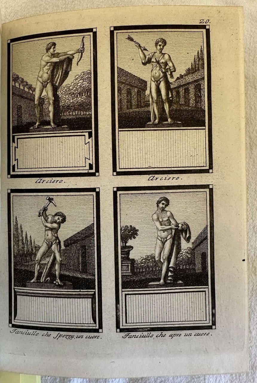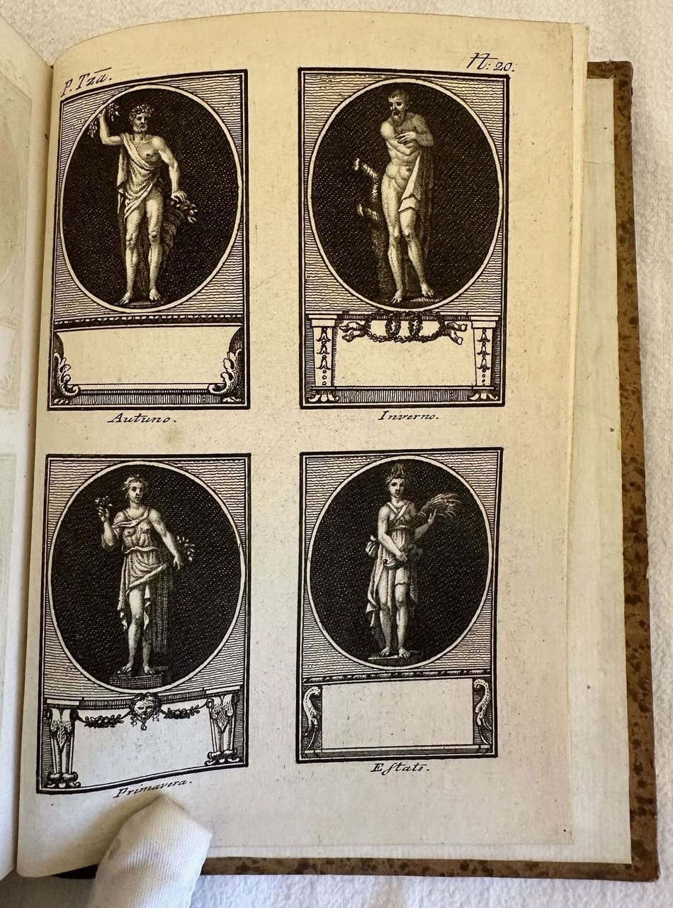 Edizione senza data ma del 1760 circa di questa opera figurata sulle statue di Firenze. L'opera è composta da tre parti legate insieme in un unico volume ed è completa. Introduzione a cura di Giovanni Chiari e catalogo delle statue del Regio Giardino di Boboli colla notizia dei loro autori. Seguono 86 tavole fuori testo la gran parte delle quali mostrano quattro statue (con Boboli come sfondo nella prima parte, uno sfondo nero o grigio nella seconda e terza parte), altre una statua singola entro ovale. Tutte le statue hanno alla base la relativa didascalia e un piccolo cartiglio vuoto poichè l'opera era un "catalogo di figurine" con fogli pubblicati a cadenza periodica perciò molto raro da trovare completo e integro. Le figurine come suggerito dall'editore stesso potevano essere utilizzate a proprio piacimento. Frontespizio calcografico dell'incisore fiorentino Gaetano Vascellini (1745-1805) con il leone fiorentino e sullo sfondo scorcio della città. In ottime condizioni. Copertina in mezza tela in ottime condizioni generali con lievi usure ai margini e dorso. Legatura in buone condizioni. Pagine in ottime condizioni con rare fioriture. In 8. cm 19x14. Pp. (2)+8+25+(2)+8+41+(2)+7+20.Edition of 1760 circa of this figurated work about the statues of Florence. The work is made up of three parts bound together in a unique volume and it is complete. Introduction by Giovanni Chiari and catalogue of statues of Regio Giardino di Boboli with ifnormation about thier authors. Then 86 out of text plates the greatest part of them featuring four statues /with Boboli in the background in the first part; grey and black background in the second and third part), the others single statues in an oval shape. all the statues have their empy didascalia beacuse the work was a catalogue of illustrations published periodically so scarce to be found complete. Calcographic title page by the florentine engraver Gaetano Vascellini (1745-1805) with the florentine lion and view of Florence in the background. In very good conditions. Half cloth cover in very good conditions lightly worn in the extremities. Binding in good conditions. Pages in very good conditions with occasional foxing. In 8. cm 19x14. Pp. (2)+8+25+(2)+8+41+(2)+7+20.