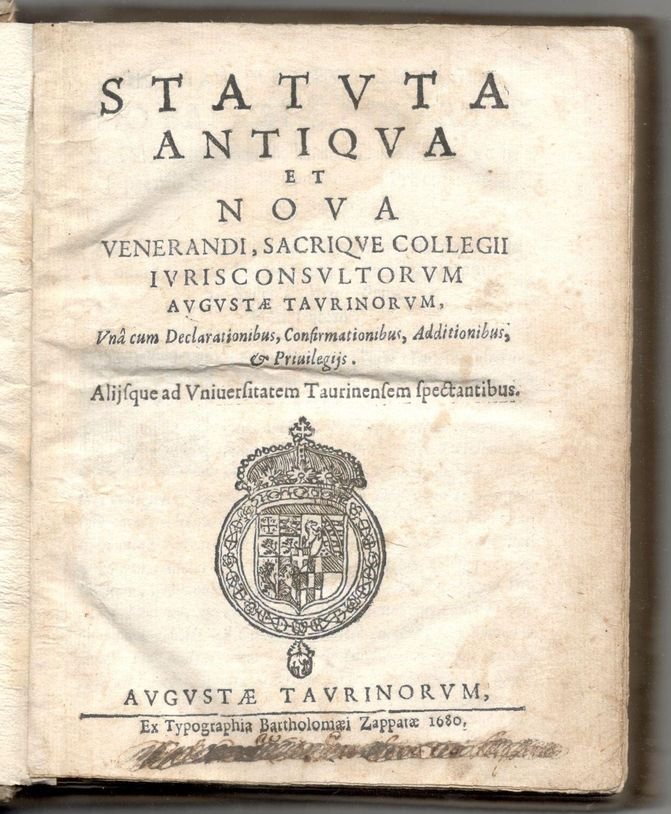Statuta Antiqua et Noua venerandi, sacrique collegii iurisconsultorum Augustae Taurinorum, Vna cum Declarationibus, Confirmationibus, Additionibus, & Priuilegijs. Alijsque ad Vniuersitatem Taurinensem spectantibus
