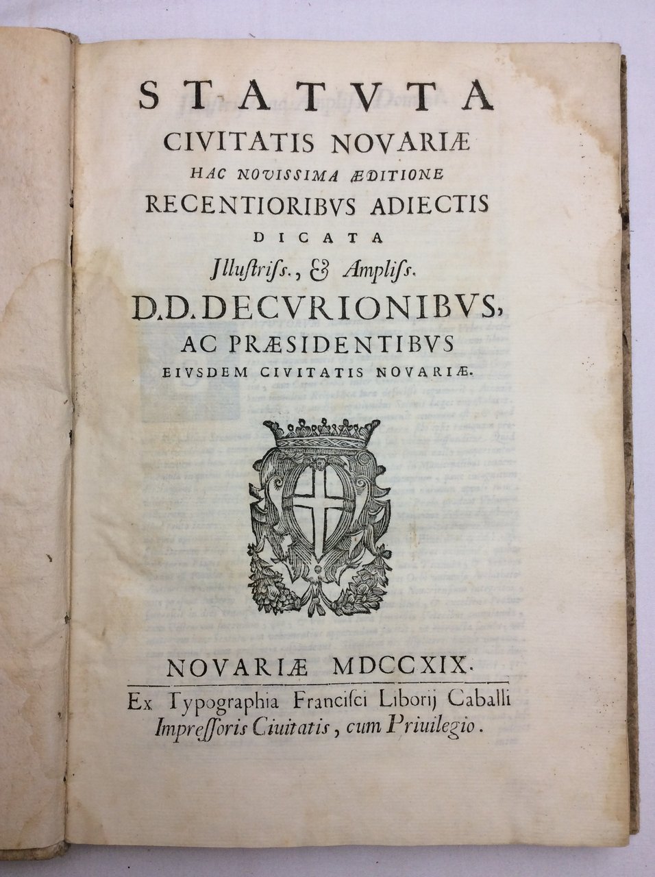 In-4 p. (mm. 301x208), cartoncino rustico coevo (con aloni e macchie), pp. (18),226,(38), stemma della città xilografato al frontespizio e vignetta con San Gaudenzio (pure xilografato) al recto dell'ultima carta. Raccolta delle leggi cioè editti, patenti, manifesti, ecc. della città di Novara. Le pagine iniziali con l'Indice sono state male inserite ma testo completo.Cfr. Fontana,II, p. 300.Con aloni marginali su alc. carte, qualche lieve fiorit. e macchiette nere sul taglio esterno, ma certamente un buon esemplare.