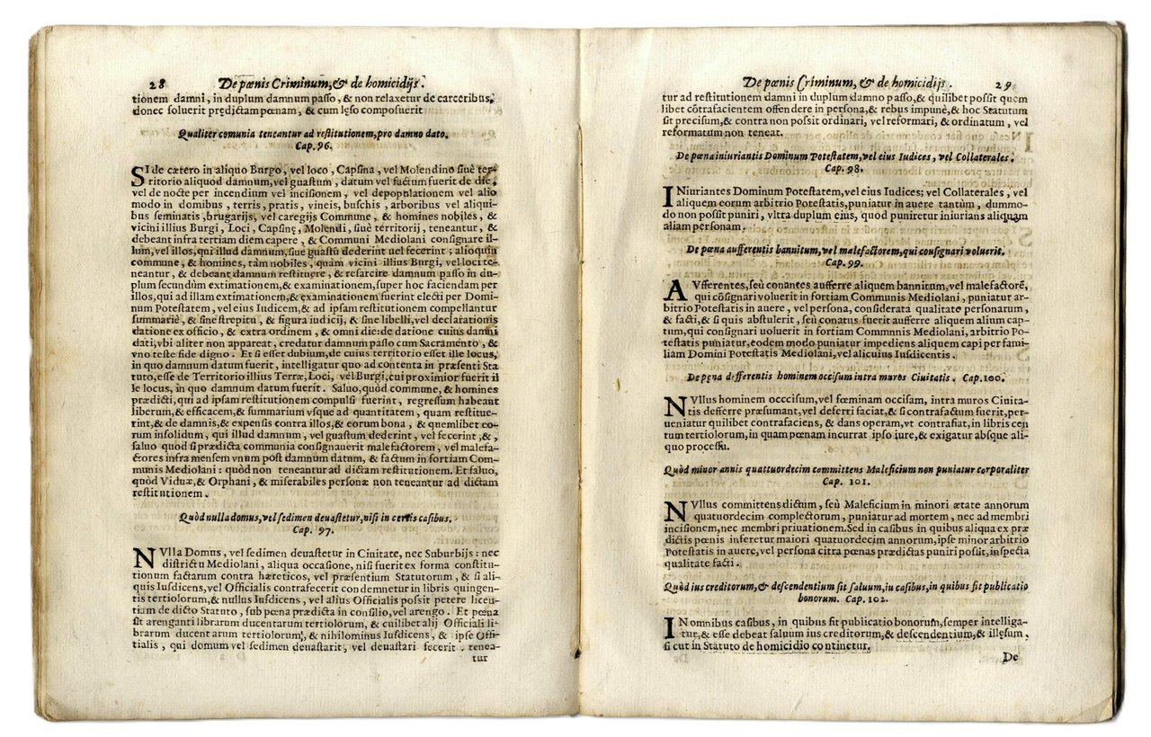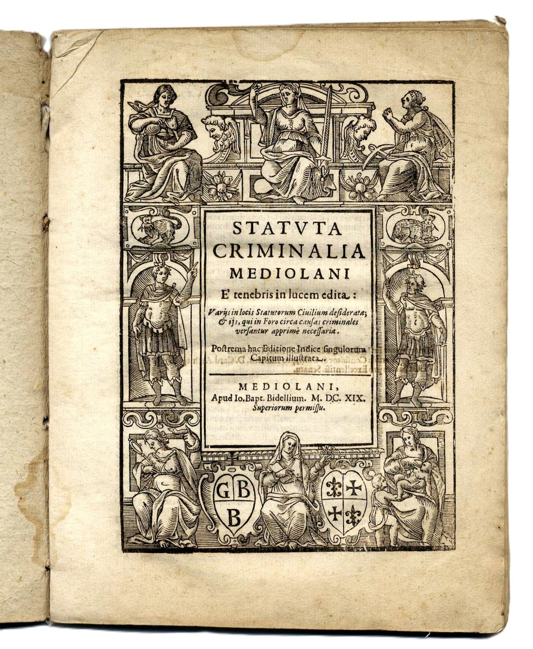 Statuta criminalia mediolani e tenebris in lucem edita: varijs in locis Statutorum Ciuilium desiderata; & ijs, qui in Foro circa causas criminales versantur apprime necessaria. Postrema hac editione indice singulorum capitum illustrata.