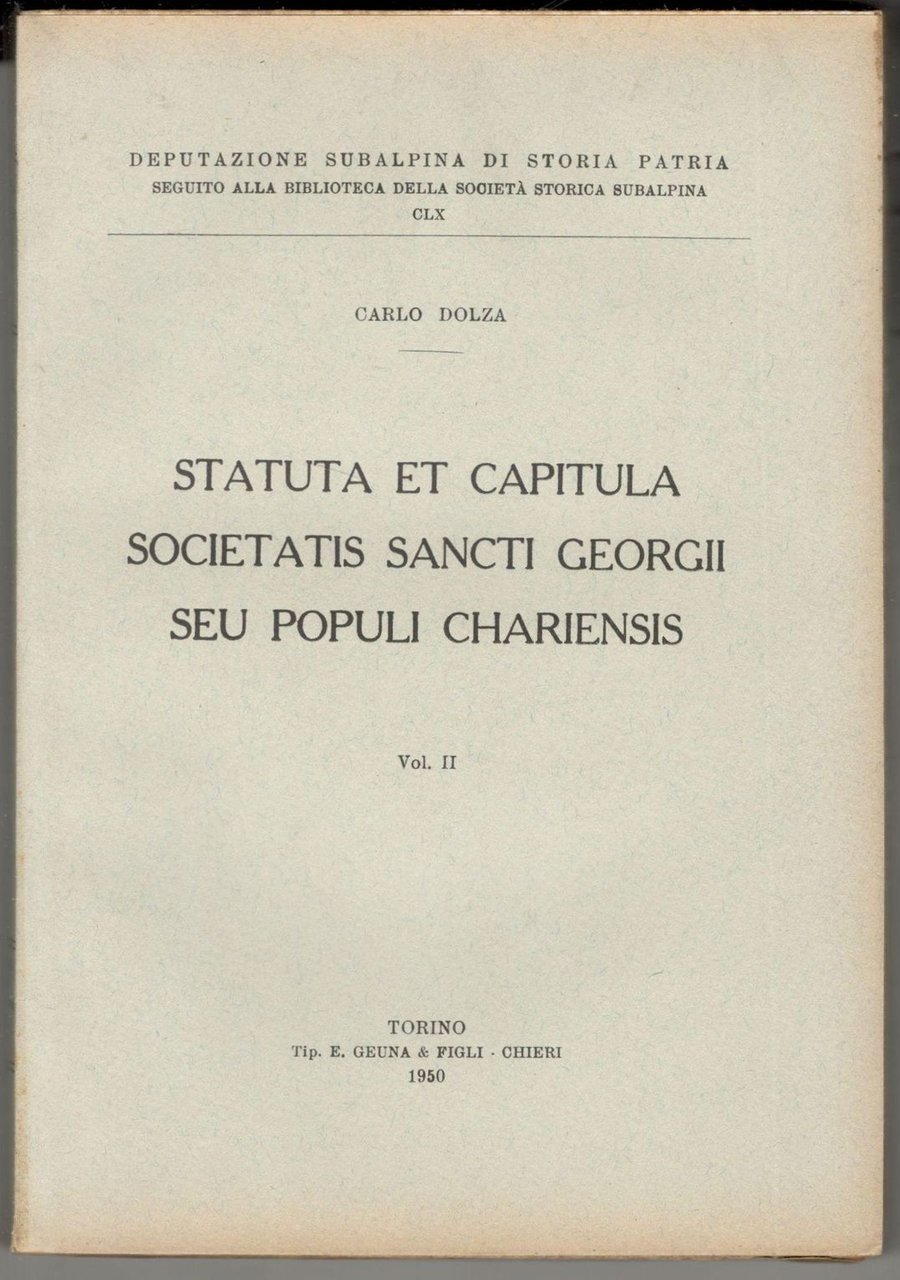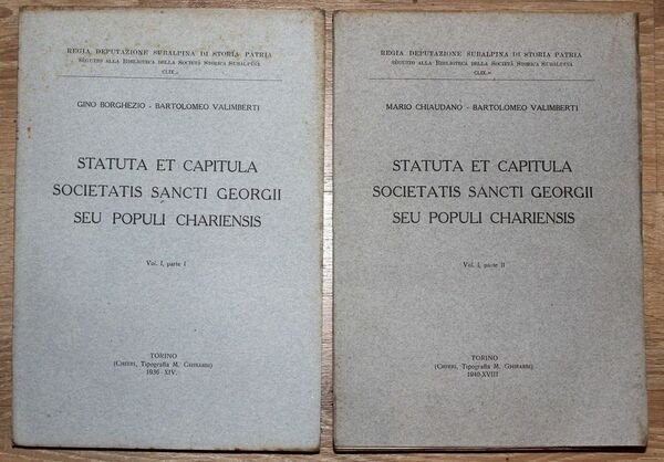 Tre volumi in 8°, pp. 244; 366; 348, (2). Brossura editoriale. Qualche ingiallitura Volumi in buono stato, interamente a fogli chiusi. Biblioteca della Società Storica Subalpina, vol. CLIX, I / II - CLX. Serie completa degli statuti e capitoli della Società di San Giorgio di Chieri, ripubblicata dopo un secolo dalla prima del Cibrario.
