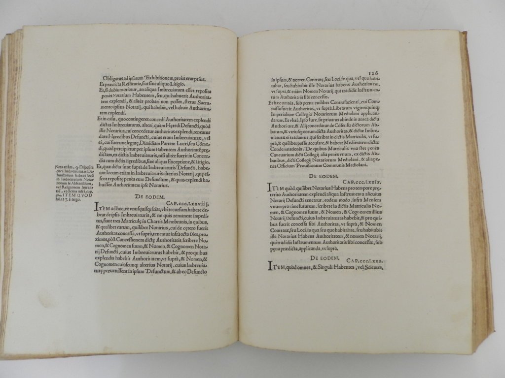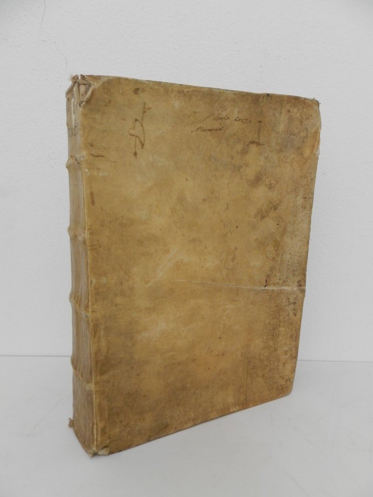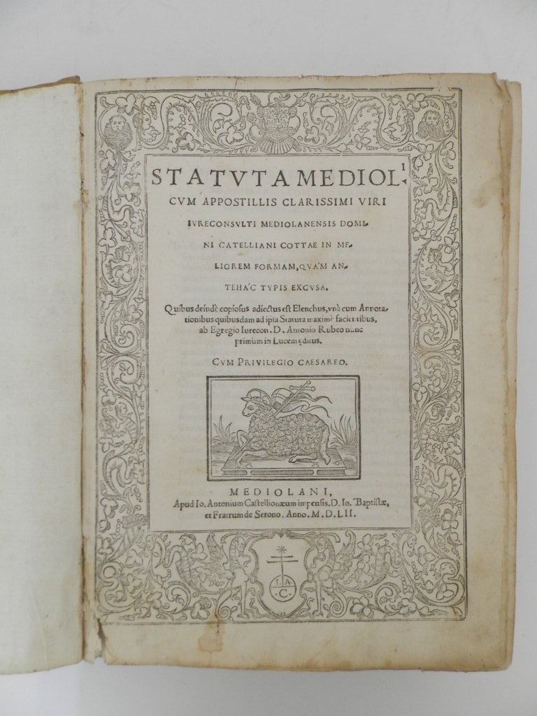 8°, mm 310x225, cc. (77), 162; (2), 164, legatura in piena pergamena antica con dorso a quattro nervi passanti e titolo manoscritto, qualche segno del tempo alla legatura che mostra un lievissimo taglio obliquo al piatto anteriore, allo stesso firma di possesso di “Maria Cozza Marzorati”, bella bordura silografica al frontespizio con vignetta allegorica al centro rappresentante un agnello, minimo strappetto con mancanze all'angolo interno delle prime tre carte, rinforzo al margine della seconda carta e strappetto restaurato alla decima carta, marginali e sporadiche gore circoscritte alle prime pagine dell'indice. La seconda parte dal titolo “Novissima Mediolani Statuta”, inizia con due carte non numerate, occhietto e dedica, al fondo bella marca tipografica. Conservato un foglio sciolto dell'Oratorio di Santa Maria Maddalena in San Sepolcro, datato 1761, adornato da interessante incisione raffigurante la Vergine retta da due angeli. Nel complesso una buona copia, genuina ed ampia di margini, anche se non esente da piccoli difetti. Importante e non comune edizione postillata dal Cotilliano Cotta. Delle tre varianti segnalate in ICCU quest'esemplare sembra avere le caratteristiche del primo stato, infatti le varianti B e C hanno i primi due quaderni dell'indice ricomposti in differente carattere tipografico rispetto agli altri. . *** TUTTI I NOSTRI LIBRI SONO VISIBILI PREVIO CONTATTO MAIL O TELEFONO NELLA NUOVA SEDE DI MILANO: LIBRERIA COSMOPOLIS, VIA JOMMELLI, 22. ***
