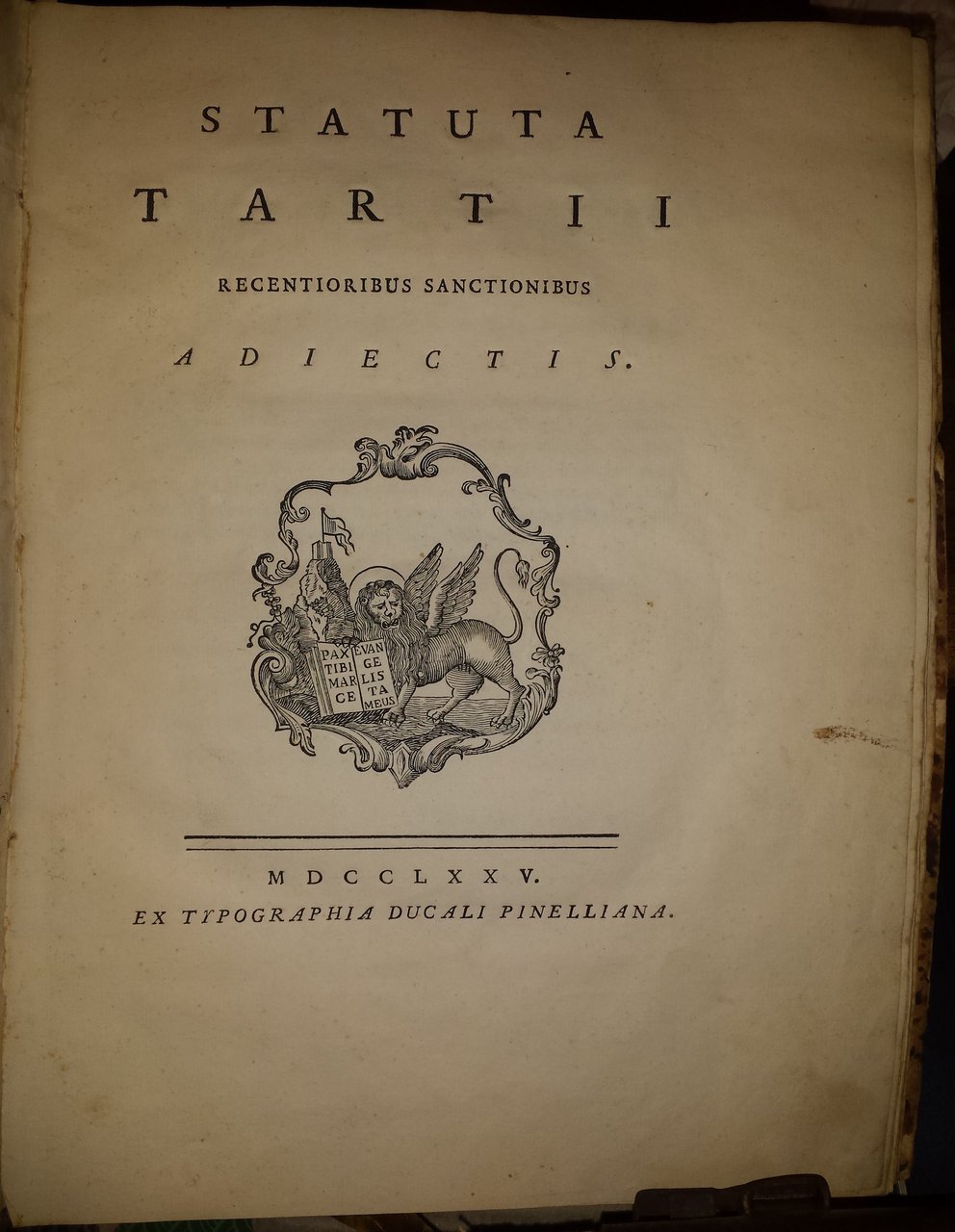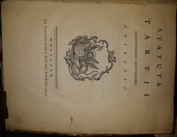 In-4 (29 cm) (2) 122. Al frontespizio Leone di San Marco con libro aperto. Legatura in cartoncino rustico coevo, rivestito di carta decorata con qualche mancanza. Mancano la carta iniziale e finale, entrambe bianche. Edizione settecentesca dello statuto già stampato nel 1620, ma riferito a quello del 1444, con le dovute aggiunte. Testo in latino ed italiano. Bibliografia degli statuti della provincia di Treviso dell'avvocato Francesco Ferro. Treviso: Stab. tip. Andreola-Medesin, 1858.