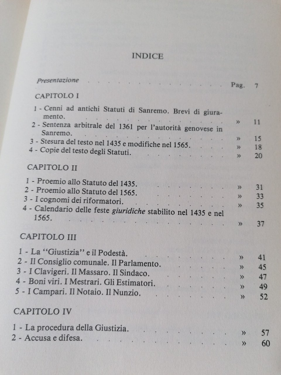 Casinò Municipale di Sanremo / Tipografia Casabianca 1983 Brossura, 371 pagine Argomenti: Antichi Statuti del Trecento e del Quattrocento, Giustizia, Figure istituzionali, Furti di bestiame, ribellioni, Prodotti alimentari, alberi fruttiferi, Commercio di palme e agrumi, Chiese Ospedali Edilizia Porto, Entrate comunali, privilegi, testo dello Statuto Condizioni: accettabili. Evidenti segni di ingiallimento al taglio laterale (vedi foto).