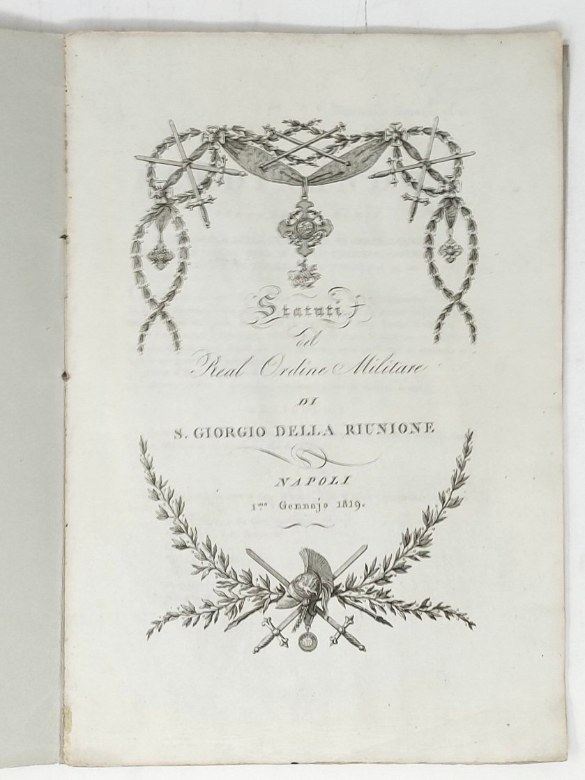 >in-4 (317x215 mm), broch. cop. fittizia. Il fascicolo si compone del titolo inciso, pp. 7 col testo della legge emanata dal re delle Due Sicilie Ferdinando I che istituisce il nuovo Ordine per «premiare le azioni di valore, ed i meriti per lunghi, ed onorati servizi di guerra» e di 5 tavole di distintivi finemente incisi. L'occasione per cui Ferdinando di Borbone fondò l'Ordine cavalleresco e militare fu la riunione dei dominii di Napoli e Sicilia in un solo reame. Non comune. Esemplare perfetto.