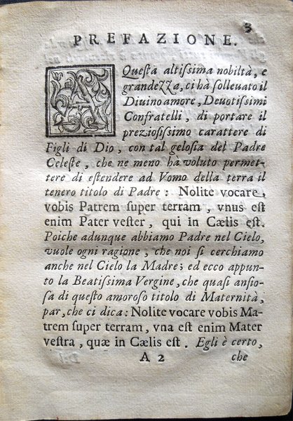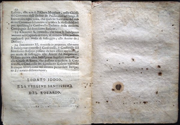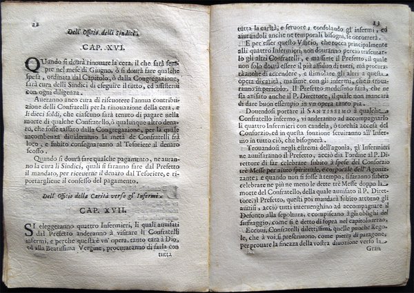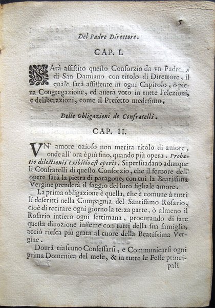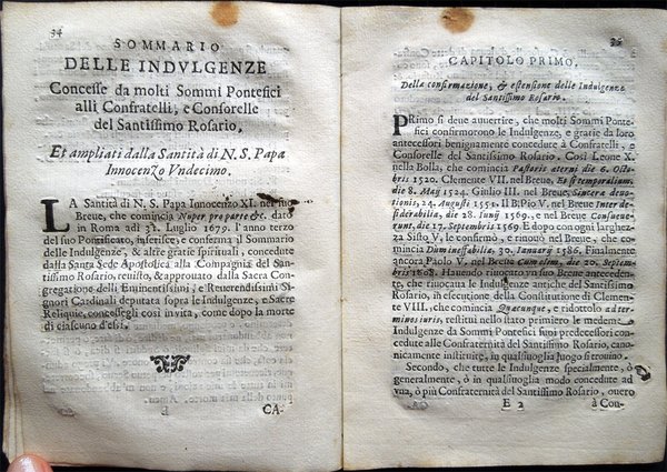 In-16° (18,6 x 13,3 cm), pp. 60, copertina coeva in carta a mano, con qualche traccia d’uso e del tempo, in particolare, alla copertina posteriore, piccolo foro di tarlo nel margine esterno e macchia d'inchiostro nella parte inferiore. Lievissime tracce d’umido al frontespizio. Nel margine superiore delle pagine dalla 33 alla 40, piccola macchia, di color marrone chiaro, del diametro di circa 1 cm, che non riguarda il testo. Nel margine esterno delle pagine dalla 51 all’ultima, piccolo foro di tarlo, lontano dal testo. Alcune piccole macchie d’inchiostro alla terza di copertina, per il resto, esemplare ben conservato. Rara pubblicazione. Le regole furono approvate, il 30 maggio 1700, dai signori: Il R. P. Onofrio da S. Gio. Priore, e Direttore; Francesco Birasco, Prefetto; Pietro Francesco Maggio, Vice Prefetto; Carlo Andrea Marchioni, primo Assistente; Pietro Antonio Benzo, secondo Assistente; Cristofforo Paglia, terzo Assistente; Domenico Pino, quarto Assistente; Nicola Ronchetti, Maestro de Novi; Gio. Francesaco Signorino, Cancelliere; Bernardo Barozzo, Tesoriere; Carlo Alciati, Sacrestano; Francesco Annone, Infermiere; Gio. Battista Manzo, Infermiere; Antonio Grasso, Infermiere; Antonio Maria Riboldo, Infermiere; Giuseppe Cavezzale, Assistente Regio; Andrea Borella; Gio. Battsta Ferrario Alber.; Giuseppe Pino; Beniamino Sirtori; Ambrogio Imberij; Christoforo Carlone; Giorgio Marazzano; Francesco Molina; Carlo Antonio Sartirana; Carlo Domenico Delfinone, Vice Cancelliere; Giuseppe Carati; Ludovico Maldonati; Francesco Stangone; Gio. Battista Borromeo; Marc'Antonio Martorino; Carlo Belviso; Gio. Angelo Annone; Giuseppe Borrano; Giuseppe Sacco; Francesco Pino; Francesco Manzone; Antonio Borella; Tomaso Zucchi; Gio. Perella; Giuseppe dell'Aqua; Antonio Latuada; Pietro Bellano; Carlo Antonio Zucchi; Giuseppe Caldarino; Gio. Battista Scagno; Francesco Casoretto; Gio. Battista Rotondo; Giuseppe Rusnati; Federico Vendramino; Francesco de Grandis; Paolo Rusca; Rocco Antonio Gianolli; Giuseppe Rontio; Pietro Paolo Bosso; Carlo Francesco Volpino; David Latuada; Francesco Mauro, Vice Sacrestano; Carlo Antonio Curione; Paolo Maria Lomazzo; Alessandro Riva; Benedetto Vandone; Giovanni Bosso; Benigno Benzi, Carlo Visconti, Michele Mazzolino. Indice: Prefazione. Cap. I. Del Padre Direttore; Cap. II. Delle obligazioni de Confratelli; Cap. III. Delle obligazioni verso li Fratelli Defunti; Cap. IV. Dell'accettazione di nuovi Confratelli; Cap. V. Delle Cause ed esclusione de Confratelli dal Consorzio; Cap. VI. Dell'elezione degli Officiali; Cap. VII. Del modo di andare alle processioni; Cap. VIII. Della Congregazione e del modo e cause di convocarla; Cap. IX. Del Capitolo e sua auttorità; Cap. X. Del Prefetto e Viceprefetto; Cap. XI. Delli quattro Assistenti; Cap. XII. Del Maestro de Nuovi; Cap. XIII. Dell'Officio del Cancelliere; Cap. XIV. Dell'Officio del Tesoriere; Cap. XV. Dell'Officio del Sagrestano; Cap. XVI. Dell'Officio delli Sindici; Cap. XVII. Dell'Officio della Carità verso gl'Infermi. Modo di accettare li fratelli nella Compagnia del Santissimo Rosario; Sommario delle indulgenze concesse da molti Sommi Pontefici alli Confratelli e Consorelle del Santissimo Rosario, et ampliati dalla Santità di N. S. Papa Innocenzo Undecimo; Capitolo I. Della confirmazione et estensione delle indulgenze del Santissimo Rosario; Capitolo II. Indulgenze che acquistano quelli che si fanno scrivere nella Confraternità del Santissimo Rosario; Capitolo III. Indulgenze che acquistano quelli che recitano il Rosario nelli giorni ordinarij; Capitolo IV. Indulgenze che conseguiscono i Confratelli recitando il Rosario ne giorni particolari dell'anno; Capitolo V. Indulgenze che acquistano li Confratelli del Santissimo Rosario accompagnando la Processione che si suol fare la prima domenica di ciascun mese e nelle Feste della Beatissima Vergine; Capitolo VI. Indulgenze che acquistano i Confratelli visitando la Capella del Santissimo Rosario; Capitolo VII. Indulgenze che conseguiscono i Confratelli e Consorelle del Santissimo Rosario nel far opere pie; Capitolo VIII. Indulgenze che conseguiscono i Confratelli e Consorelle del Santissimo Rosario visitando i cinque Altari; Capitolo IX. Indulgenze che acquistano i Confratelli e Consorelle del Santissimo Rosario confessandosi e communicandosi in alcune Domeniche dell'anno; Capitolo X. Indulgenze che conseguiscono i Confratelli e Consorelle del Santissimo Rosario nel ponto della morte; Capitolo XI. Estensione delle predette Indulgenze alli Infermi o legittimamente impediti; Capitolo XII. Indulgenze per li Defonti.