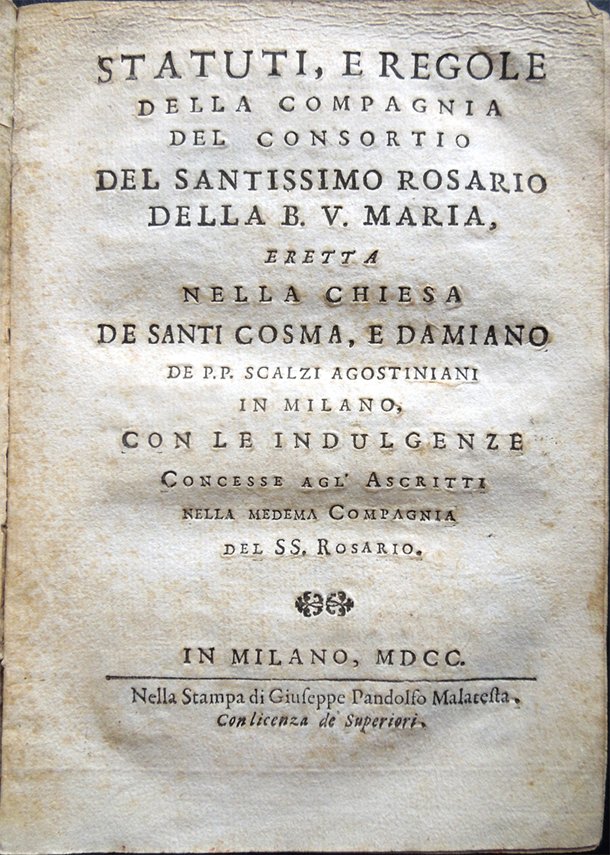 Statuti e regole della Compagnia del Consortio del Santissimo Rosario della B. V. Maria eretta nella Chiesa de Santi Cosma e Damiano de P. P. Scalzi Agostiniani in Milano, con le indulgenze concesse agl'Ascritti nella medesima Comp del SS. Rosario
