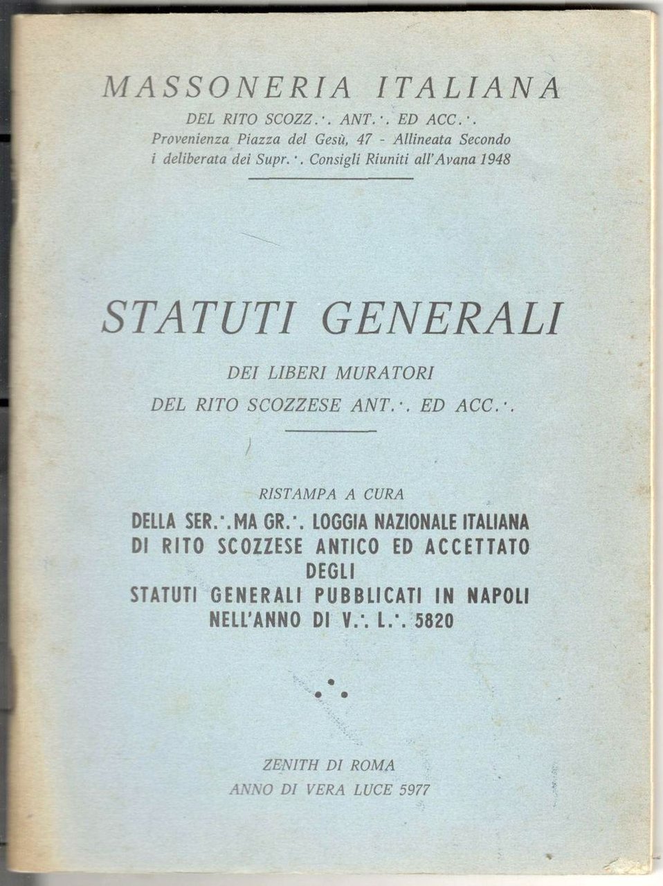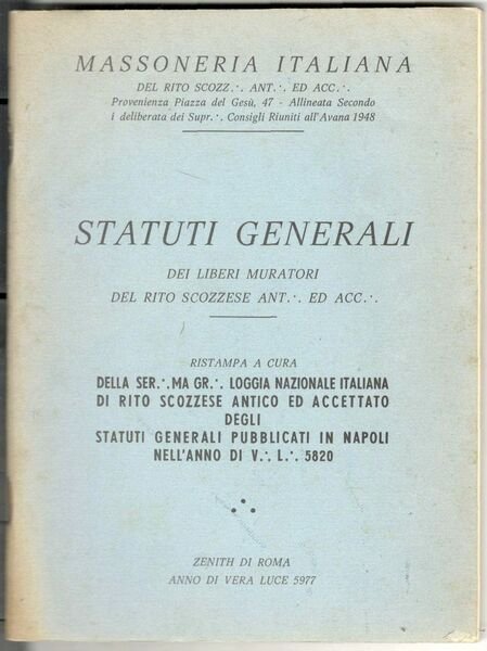 Statuti generali dei Liberi Muratori del Rito Scozzese ant.: ed acc.: Ristampa a cura della Ser.:ma Gr.: Loggia Nazionale Italiana di Rito Scozzese antico ed accettato degli statuti generali pubblicati in Napoli nell'anno di V.: L.: 5820
