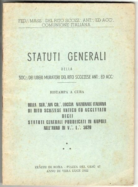 Statuti generali della Soc.: dei Liberi Muratori del Rito Scozzese ant.: ed acc.: Ristampa a cura della Ser.:ma Gr.: Loggia Nazionale Italiana di Rito Scozzese antico ed accettato degli statuti generali pubblicati in Napoli nell'anno di V.: L.: 5820