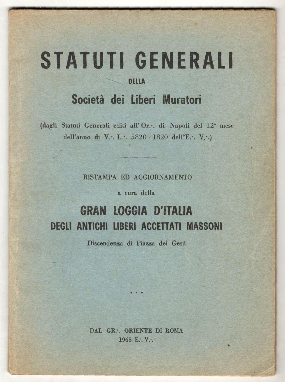 Statuti generali della Società dei Liberi Muratori (dagli Statuti Generali editi all'Or.: di Napoli del 12° mese dell'anno di V.: L.: 5820 - 1820 dell'E.: V.:. Ristampa de aggiornamento a cura della Gran Loggia d'Italia degli antichi liberi accettati massoni. Discendenza di Piazza del Gesù