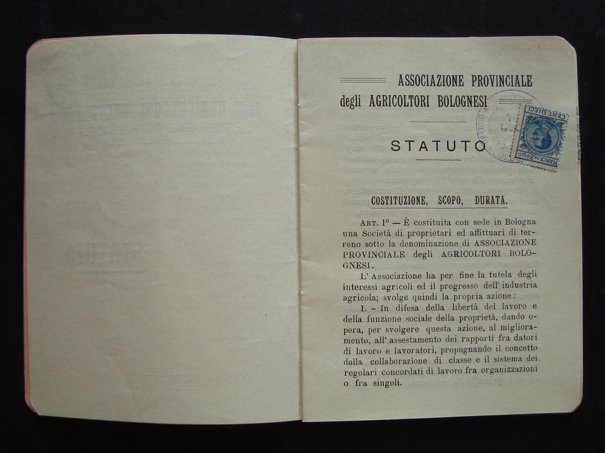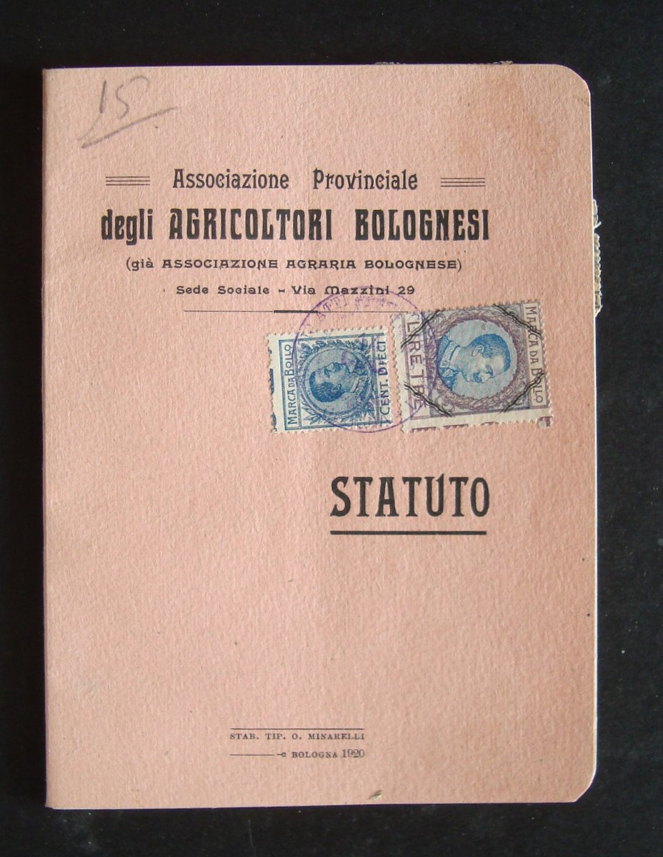 STATUTO ASSOCIAZIONE PROV AGRICOLTORI BOLOGNESI TIP MINARELLI BOLOGNA 1920