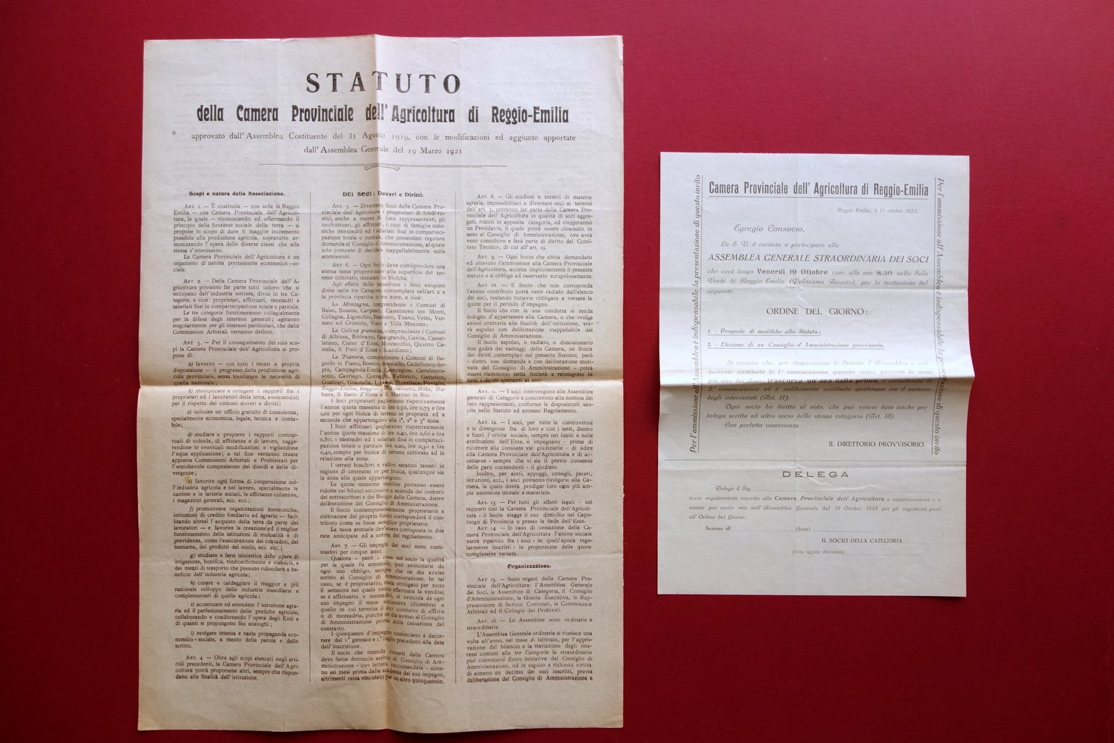 Statuto (foglio volante) pi√π lettera di delega, Statuto della Camera Provinciale dell'Agricoltura di Reggio Emilia approvato dall'Assemblea Costituente del 31 agosto 1919, con le modificazioni ed aggiunte apportate dall'Assemblea Generale del 19 marzo 1921 e lettera per delega di voto all'Assemblea Generale Straordinaria dei Soci Stab. tip. A. Bassi - Reggio Emilia, 1921; statuto a stampa su foglio volante di grande formato; testo su tre colonne, a entrambi i lati (vedi foto). Al retro applicata etichetta a stampa per spedizione postale. Cm 49,5x34,5. Foglio volante - lettera di delega a stampa su carta; sezioni bianche intonse (non utilizzata). Cm 32x22. Condizioni di conservazione Esemplari entambi in buone condizioni con minimi segni del tempo dovuti al tipo di carta, pieghe di conservazione, poche minuscole bruniture. Per maggiori dettagli vedi foto. SC03.D17474 N
