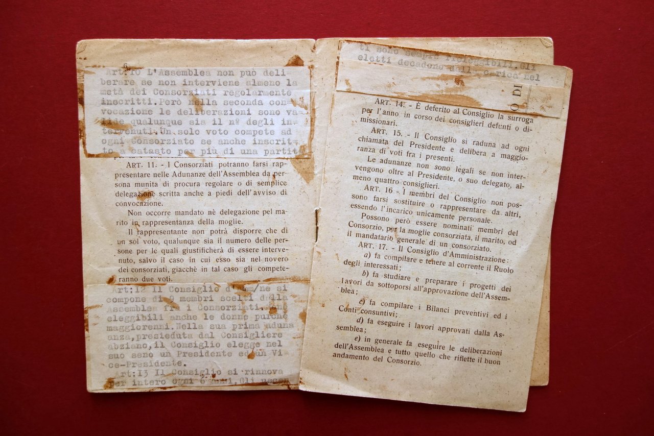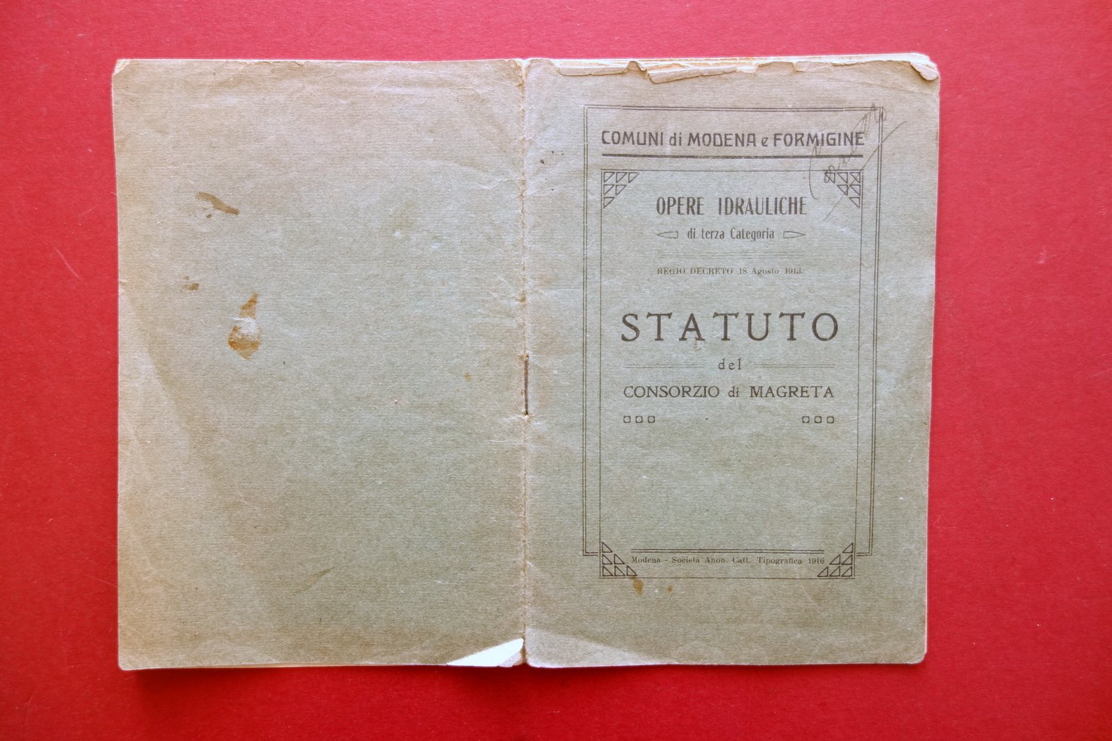 Opuscolo, Comuni di Modena e Formigine Opere idrauliche di terza categoria Regio decreto 18 agosto 1913 - Statuto del Consorzio di Magreta Soc. An. Catt. Tipografica, Modena 1916; cm 17x11; pp. 14; alcuni articoli corretti mediante etichetta dattiloscritta applicata (vedi foto). Brossura ed. Condizioni di conservazione Esemplare complessivamente in buono stato con tracce d'uso, brossure con minimi accenni di ingiallimento, qualche piccolo marginale strappetto; alla brossura post. poche piccole macchiette. Interni con alcune bruniture; alcuni articoli corretti mediante etichetta dattiloscritta applicata (vedi foto). OPEB.4949 N