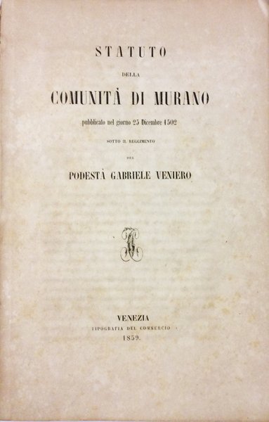 STATUTO DELLA COMUNITA' DI MURANO. - Pubblicato nel giorno 25 Dicembre 1502 sotto il Reggimento del Podestà Gabriele Veniero.