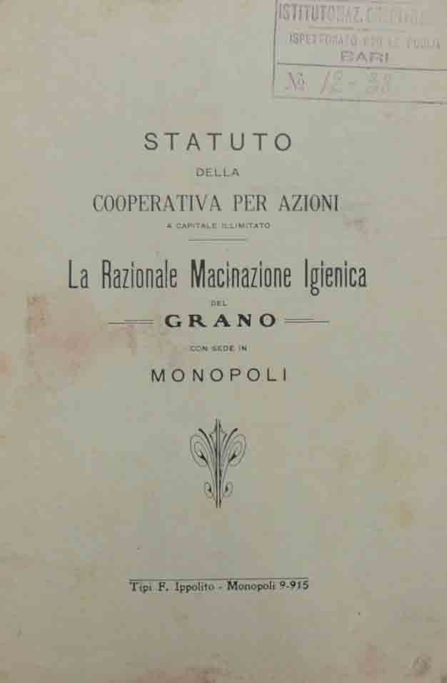 Statuto della Coopeartiva per azioni a capitale illimitato La razionale Macinazione Igienica del Grano con sede in Monopoli, Tipi F. Ippolito, Monopoli 1915, pp. 15, cm 21, opuscolo spillato. Alla prima di copertina, timbro con numero progressivo di inventario dell’Istituto Naz. Credito Coop. - Ispettorato per le Puglie - Bari. Leggere tracce d’uso alla copertina, con aloni e qualche strappetto ai margini, per il resto sgualciture, uniforme brunitura della carta, ma buona copia. Estremamente raro.