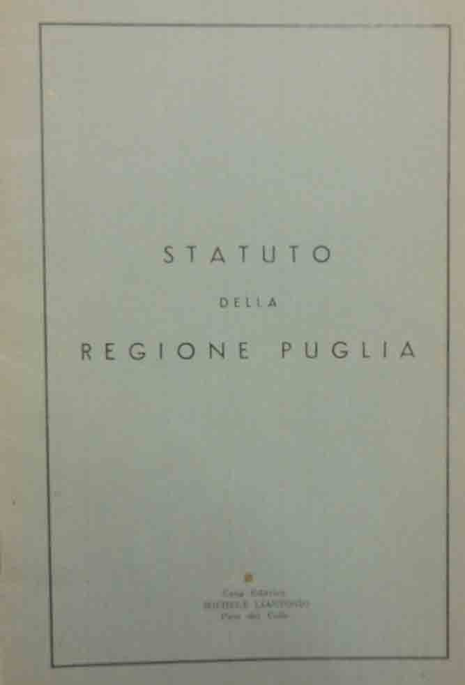 Statuto della Regione Puglia, Casa Editrice Michele Liantonio, Palo del Colle s.d. (1970?), pp. 28, cm 20, opuscolo spillato. In allegato: Elenco dei Consiglieri e della Giunta Regionale eletti per la Regione Puglia con le prime elezioni regionali nel giugno 1970. Una macchiolina alla prima di copertina, minimesgualciture, lievissima brunitura della carta, per il resto perfetto.