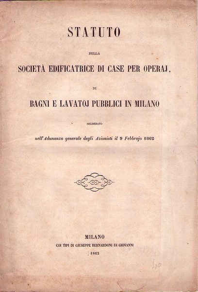 Statuto della Società Edificatrice di Case per operaj di bagni e lavatoj pubblici in Milano deliberato nell'Adunanza generale degli Azionisti il 9 febbrajo 1862. Statuto della Società Edificatrice di case per operai di bagni e lavatoi pubblici.