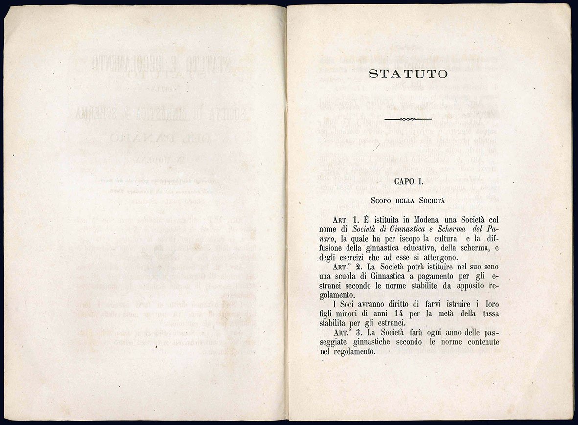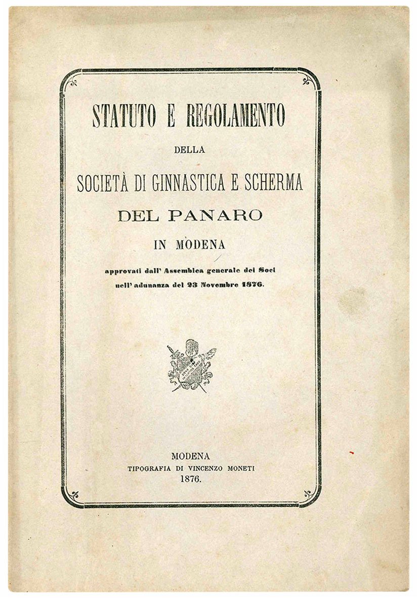 Statuto e Regolamento della Società di Ginnastica e Scherma del Panaro in Modena. Approvati dall'Assemblea generale dei Soci nell'adunanza del 23 Novembre 1876.