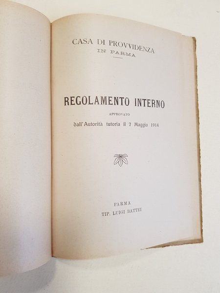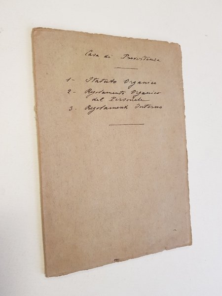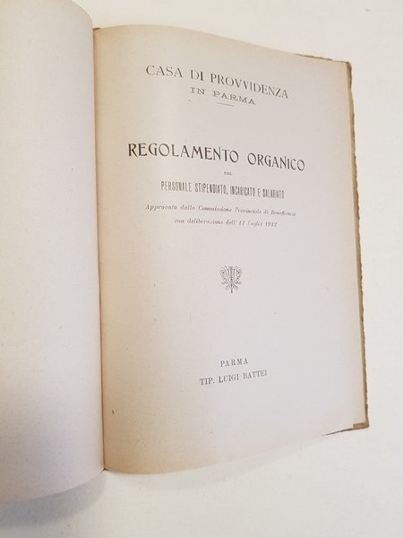 Segue:<BR>Regolamento organico del personale stipendiato, incaricato e salariato. Approvato dalla Commissione Provinciale di Beneficienza con deliberazione dell'11 luglio 1912 - Regolamento interno approvato dall'Autorità tutoria il 7 Maggio 1914.<BR> In 8°; pp. 19 (20), 18 (1), 41 (1); brossura muta con titoli scritti a mano al piatto; cucito.<BR>CONDIZIONI MOLTO BUONE