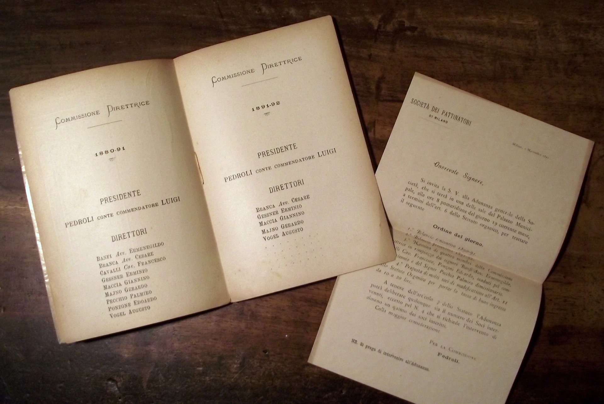 >in-16, pp. 45, broch. edit. Statuto dei soci, commissione direttrice degli anni 1880-91 e 1891-1892, elenco generale dei soci, consuntivo 1890-91 e presuntivo dell'anno 1891-92. Nell'elenco dei soci il Conte Borromeo, il Principe e la Principessa Gonzaga, il Marchese Malaspina, il Marchese Trivulzio, ecc. Buon esemplare, con annessa la lettera a stampa sciolta di convocazione dell'Adunanza Generale dell'associazione, datata Milano, 1 novembre 1891.
