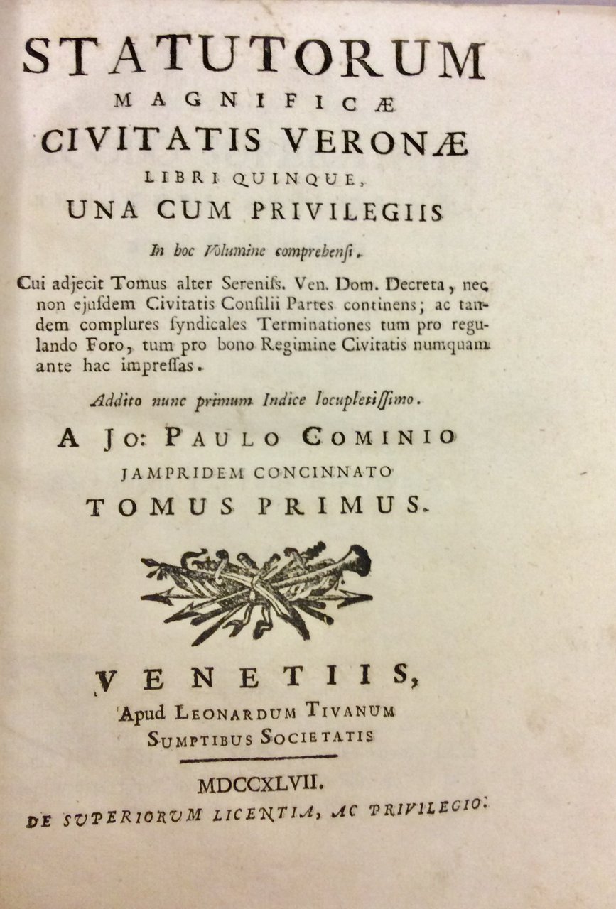 In-8 gr. (mm. 247x188), 2 tomi in 1 volume, cartoncino rustico coevo (dorso rifatto, tracce d'uso ai piatti), titolo ms. su etichetta al dorso, pp.num. (24),578,(2); (4),318,(2). Cui adjecit Tomus alter Sereniss. Ven. Dom. Decreta, nec non ejusdem Civitatis Consilii Partes continens; ac tandem complures syndicales Terminationes tum pro regulando Foro, tum pro bono Regimine Civitatis numquam ante hac impressas. Cfr. Lozzi,I,606: La più compleeta di tutte le edizioni precedenti: vi è anche la spiegazione delle Voci oscure dello Stato di Verona - Fontana,III, p. 321.Fresco esemplare con barbe, ben conservato.